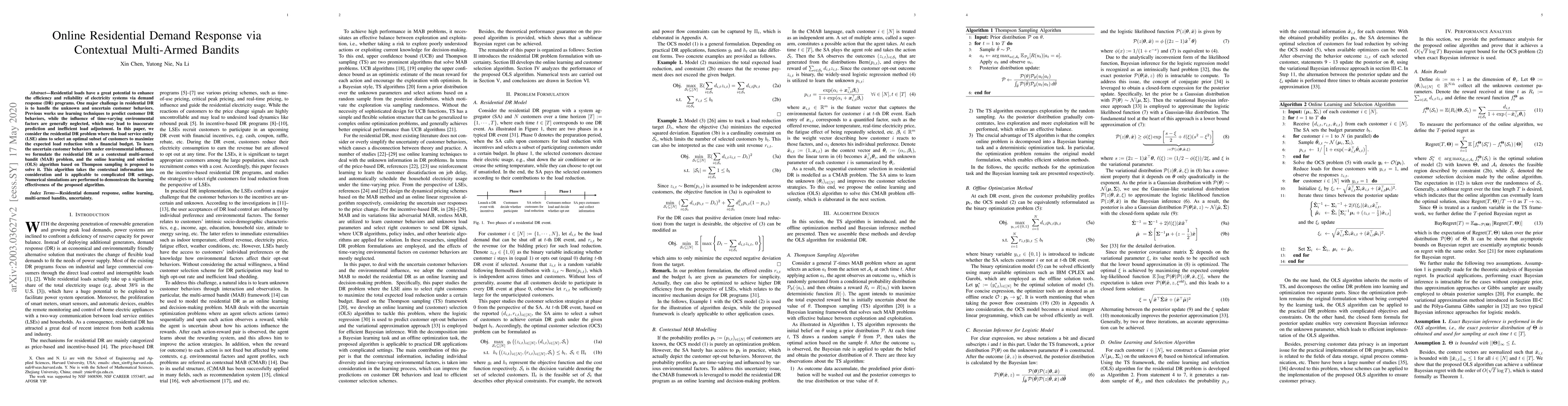 Residential loads have great potential to enhance the efficiency and reliability of electricity systems via demand response (DR) programs. One major challenge in residential DR is to handle the unknown and uncertain customer behaviors. Previous works use learning techniques to predict customer DR behaviors, while the influence of time-varying environmental factors is generally neglected, which may lead to inaccurate prediction and inefficient load adjustment. In this paper, we consider the residential DR problem where the load service entity (LSE) aims to select an optimal subset of customers to maximize the expected load reduction with a financial budget. To learn the uncertain customer behaviors under the environmental influence, we formulate the residential DR as a contextual multi-armed bandit (MAB) problem, and the online learning and selection (OLS) algorithm based on Thompson sampling is proposed to solve it. This algorithm takes the contextual information into consideration and is applicable to complicated DR settings. Numerical simulations are performed to demonstrate the learning effectiveness of the proposed algorithm.