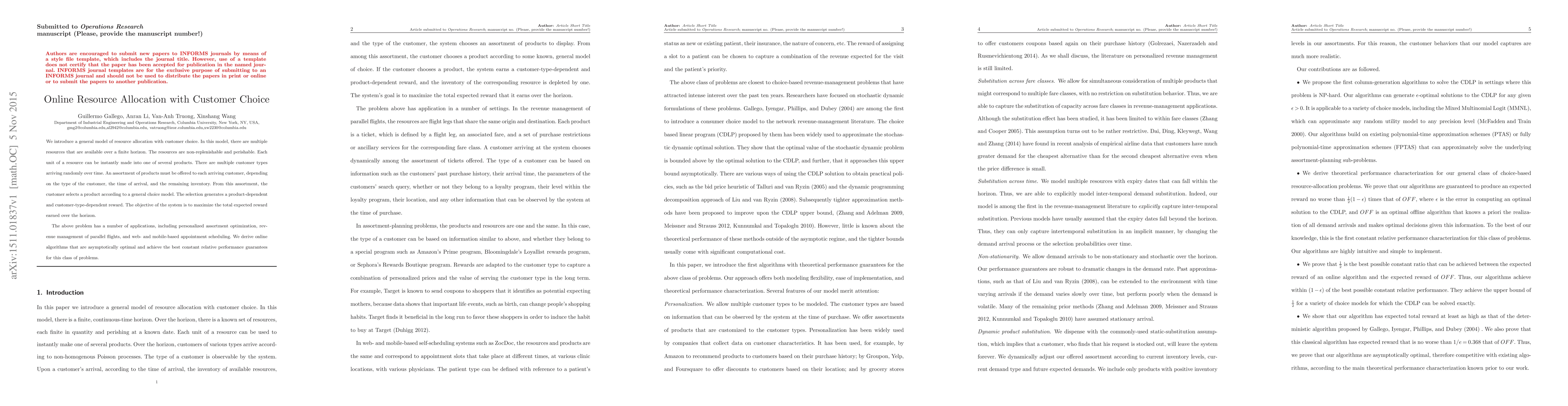 This research paper introduces a model for resource allocation with customer choice, aiming to maximize total expected reward over time, with applications in assortment optimization, revenue management, and appointment scheduling.