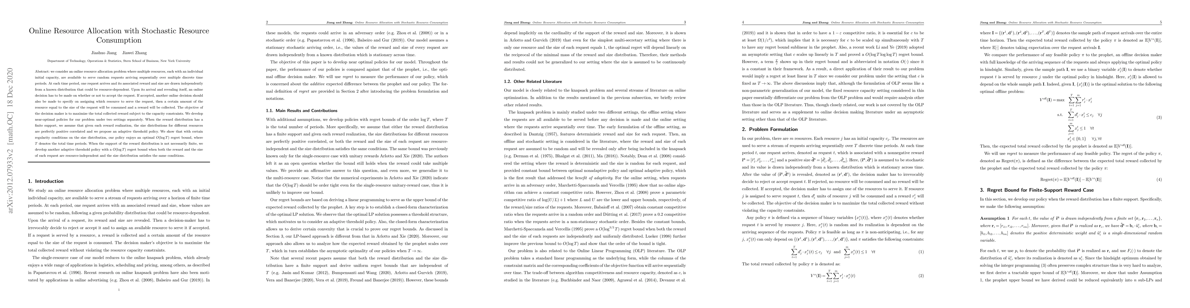 This paper addresses an online resource allocation problem with stochastic resource consumption, developing near-optimal policies to maximize total reward under capacity constraints. It proposes adaptive threshold policies with $O(\log T)$ regret bounds under different conditions, including finite and non-finite reward distributions.