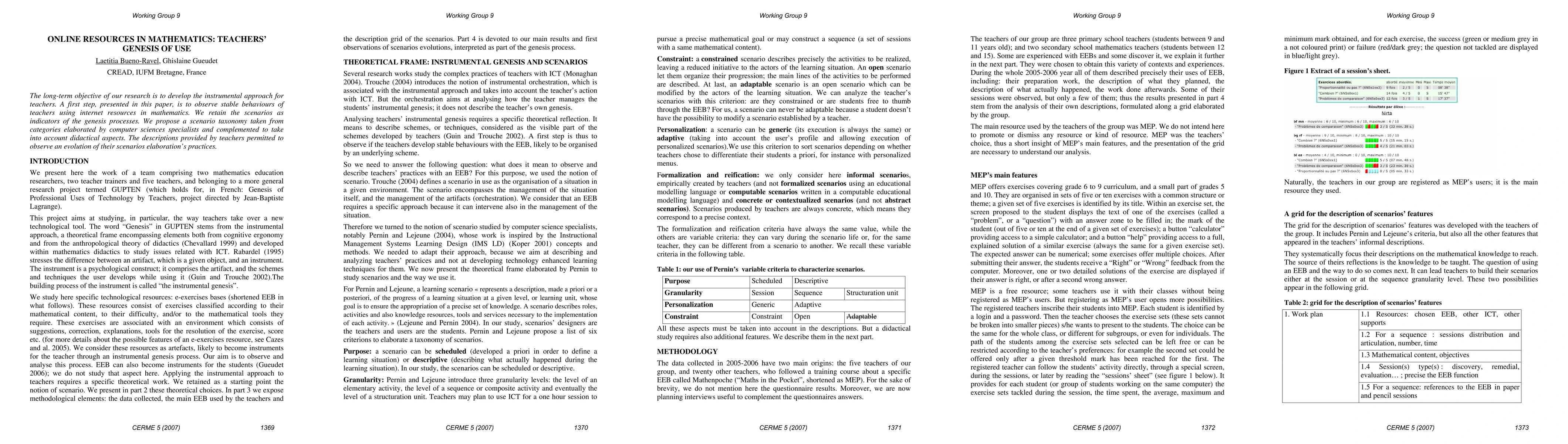 The long-term objective of our research is to develop the instrumental approach for teachers. A first step, presented in this paper, is to observe stable behaviours of teachers using internet resources in mathematics. We retain the scenarios as indicators of the genesis processes. We propose a scenario taxonomy taken from categories elaborated by computer sciences specialists and complemented to take into account didactical aspects. The descriptions provided by teachers permitted to observe an evolution of their scenarios elaboration's practices.