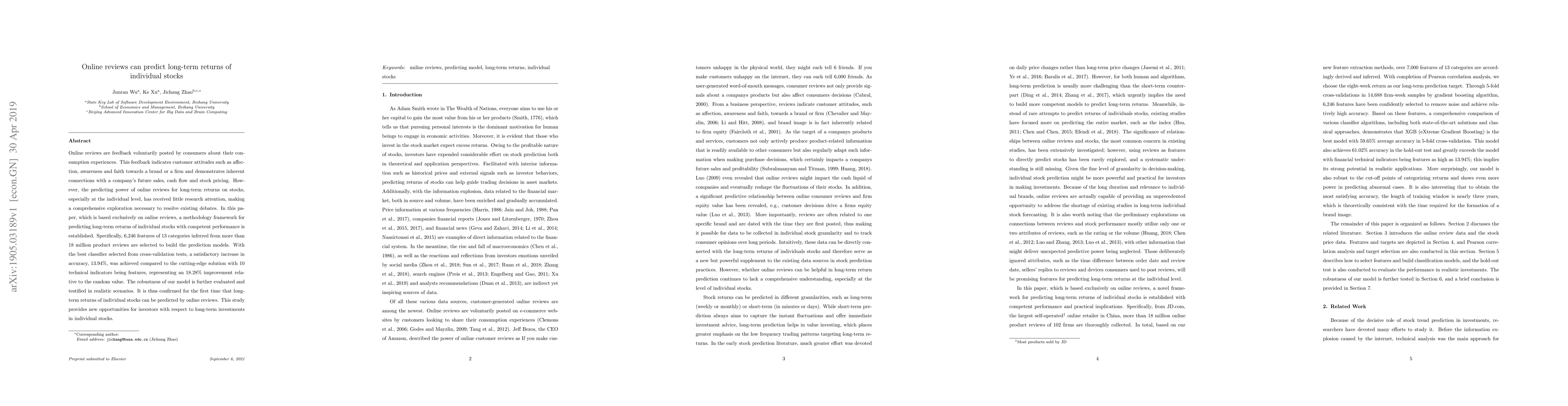 Online reviews are feedback voluntarily posted by consumers about their consumption experiences. This feedback indicates customer attitudes such as affection, awareness and faith towards a brand or a firm and demonstrates inherent connections with a company's future sales, cash flow and stock pricing. However, the predicting power of online reviews for long-term returns on stocks, especially at the individual level, has received little research attention, making a comprehensive exploration necessary to resolve existing debates. In this paper, which is based exclusively on online reviews, a methodology framework for predicting long-term returns of individual stocks with competent performance is established. Specifically, 6,246 features of 13 categories inferred from more than 18 million product reviews are selected to build the prediction models. With the best classifier selected from cross-validation tests, a satisfactory increase in accuracy, 13.94%, was achieved compared to the cutting-edge solution with 10 technical indicators being features, representing an 18.28% improvement relative to the random value. The robustness of our model is further evaluated and testified in realistic scenarios. It is thus confirmed for the first time that long-term returns of individual stocks can be predicted by online reviews. This study provides new opportunities for investors with respect to long-term investments in individual stocks.