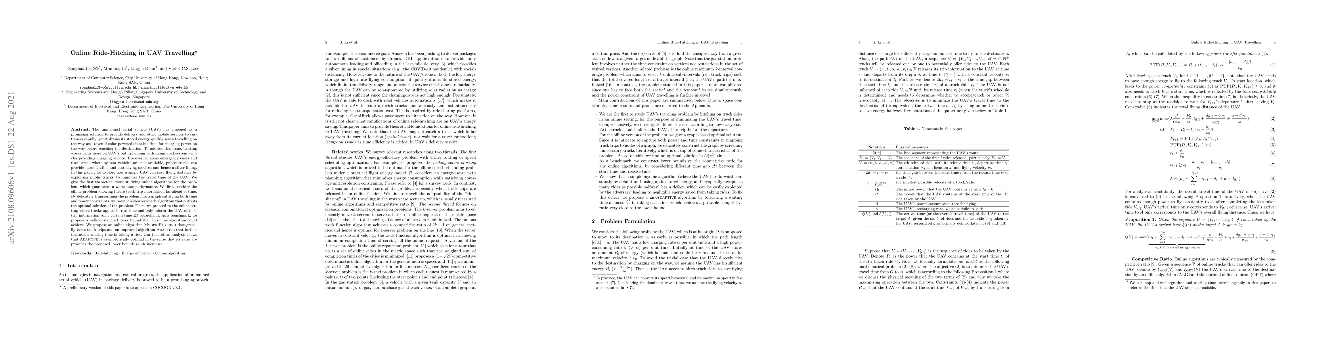 The unmanned aerial vehicle (UAV) has emerged as a promising solution to provide delivery and other mobile services to customers rapidly, yet it drains its stored energy quickly when travelling on the way and (even if solar-powered) it takes time for charging power on the way before reaching the destination. To address this issue, existing works focus more on UAV's path planning with designated system vehicles providing charging service. However, in some emergency cases and rural areas where system vehicles are not available, public trucks can provide more feasible and cost-saving services and hence a silver lining. In this paper, we explore how a single UAV can save flying distance by exploiting public trucks, to minimize the travel time of the UAV. We give the first theoretical work studying online algorithms for the problem, which guarantees a worst-case performance. We first consider the offline problem knowing future truck trip information far ahead of time. By delicately transforming the problem into a graph satisfying both time and power constraints, we present a shortest-path algorithm that outputs the optimal solution of the problem. Then, we proceed to the online setting where trucks appear in real-time and only inform the UAV of their trip information some certain time $\Delta t$ beforehand. As a benchmark, we propose a well-constructed lower bound that an online algorithm could achieve. We propose an online algorithm MyopicHitching that greedily takes truck trips and an improved algorithm $\Delta t$-Adaptive that further tolerates a waiting time in taking a ride. Our theoretical analysis shows that $\Delta t$-Adaptive is asymptotically optimal in the sense that its ratio approaches the proposed lower bounds as $\Delta t$ increases.