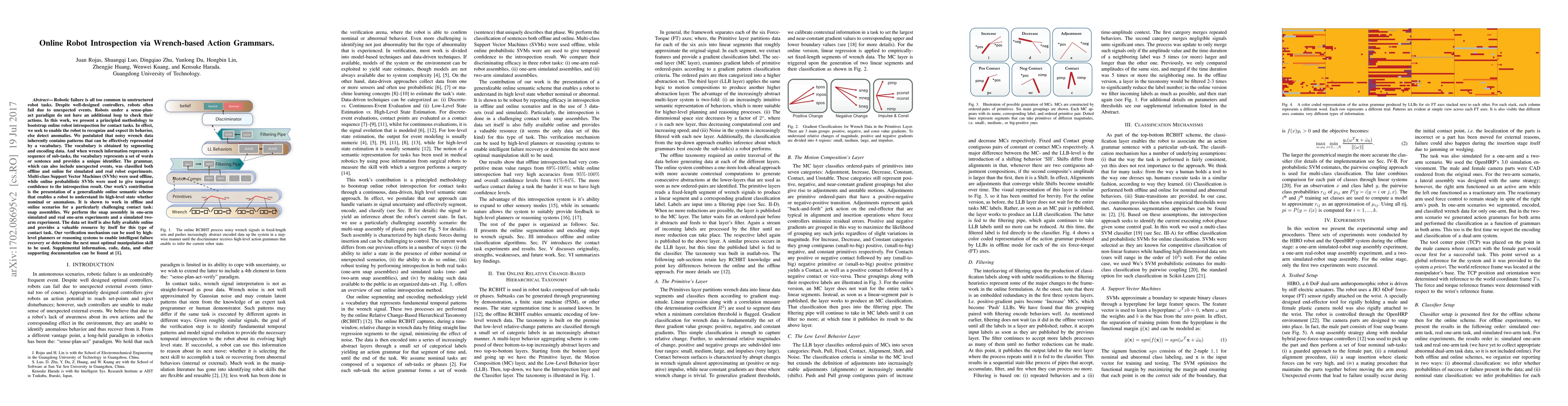 Robotic failure is all too common in unstructured robot tasks. Despite well-designed controllers, robots often fail due to unexpected events. How do robots measure unexpected events? Many do not. Most robots are driven by the sense-plan act paradigm, however more recently robots are undergoing a sense-plan-act-verify paradigm. In this work, we present a principled methodology to bootstrap online robot introspection for contact tasks. In effect, we are trying to enable the robot to answer the question: what did I do? Is my behavior as expected or not? To this end, we analyze noisy wrench data and postulate that the latter inherently contains patterns that can be effectively represented by a vocabulary. The vocabulary is generated by segmenting and encoding the data. When the wrench information represents a sequence of sub-tasks, we can think of the vocabulary forming a sentence (set of words with grammar rules) for a given sub-task; allowing the latter to be uniquely represented. The grammar, which can also include unexpected events, was classified in offline and online scenarios as well as for simulated and real robot experiments. Multiclass Support Vector Machines (SVMs) were used offline, while online probabilistic SVMs were are used to give temporal confidence to the introspection result. The contribution of our work is the presentation of a generalizable online semantic scheme that enables a robot to understand its high-level state whether nominal or abnormal. It is shown to work in offline and online scenarios for a particularly challenging contact task: snap assemblies. We perform the snap assembly in one-arm simulated and real one-arm experiments and a simulated two-arm experiment. This verification mechanism can be used by high-level planners or reasoning systems to enable intelligent failure recovery or determine the next most optima manipulation skill to be used.