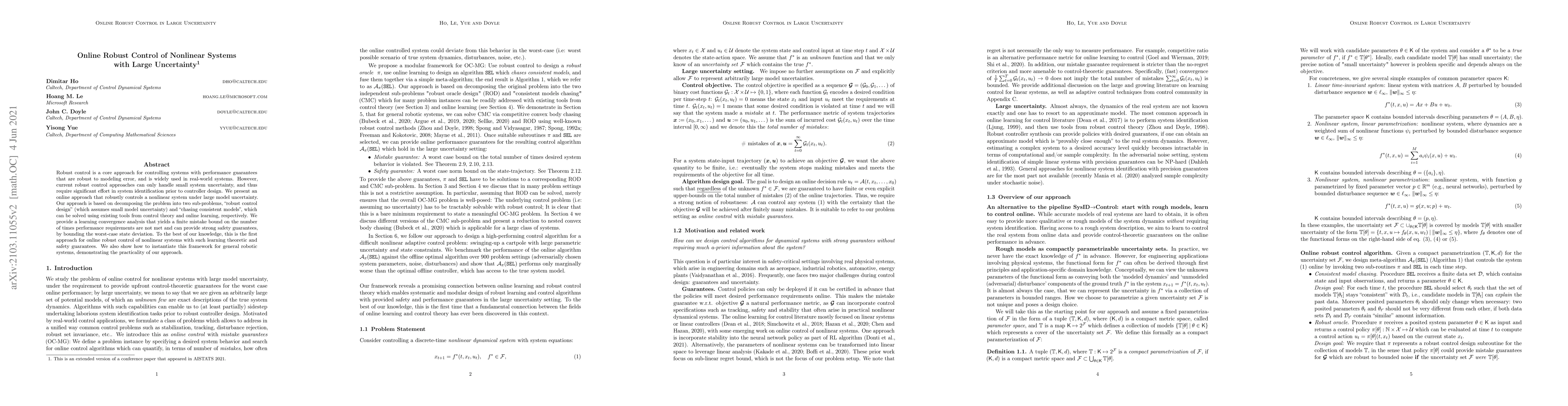 This paper presents an innovative online robust control method for nonlinear systems with large uncertainty, decomposing the problem into robust control design and model consistency chasing. It provides a learning convergence analysis with safety guarantees and demonstrates the framework's application to general robotic systems.