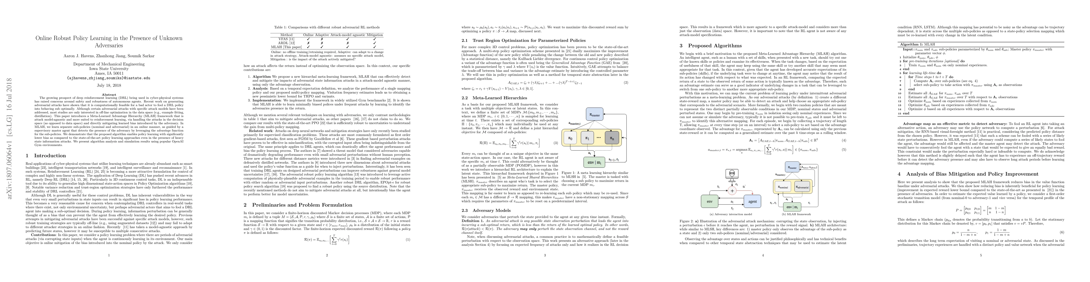 The growing prospect of deep reinforcement learning (DRL) being used in cyber-physical systems has raised concerns around safety and robustness of autonomous agents. Recent work on generating adversarial attacks have shown that it is computationally feasible for a bad actor to fool a DRL policy into behaving sub optimally. Although certain adversarial attacks with specific attack models have been addressed, most studies are only interested in off-line optimization in the data space (e.g., example fitting, distillation). This paper introduces a Meta-Learned Advantage Hierarchy (MLAH) framework that is attack model-agnostic and more suited to reinforcement learning, via handling the attacks in the decision space (as opposed to data space) and directly mitigating learned bias introduced by the adversary. In MLAH, we learn separate sub-policies (nominal and adversarial) in an online manner, as guided by a supervisory master agent that detects the presence of the adversary by leveraging the advantage function for the sub-policies. We demonstrate that the proposed algorithm enables policy learning with significantly lower bias as compared to the state-of-the-art policy learning approaches even in the presence of heavy state information attacks. We present algorithm analysis and simulation results using popular OpenAI Gym environments.
