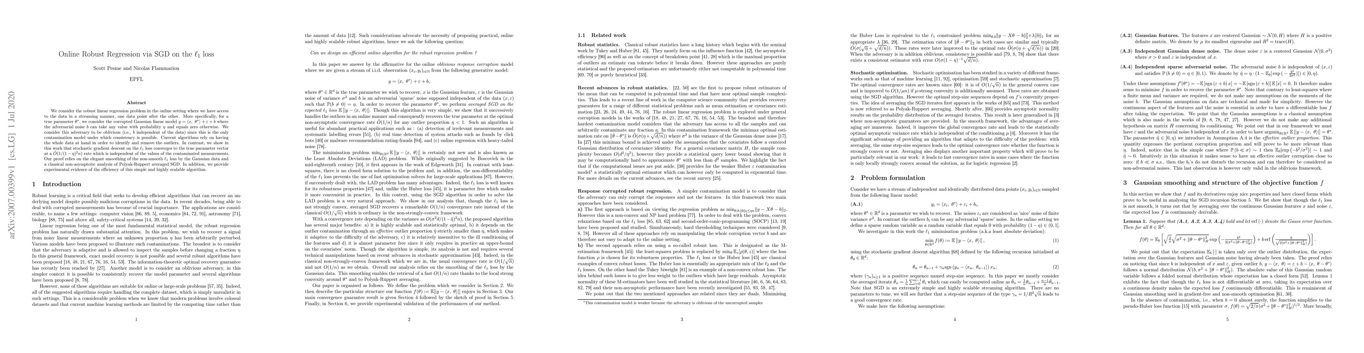 This paper proposes an online robust linear regression method using stochastic gradient descent (SGD) on the $\ell_1$ loss for streaming data. It demonstrates that SGD on the $\ell_1$ loss converges to the true parameter vector at a rate independent of the contaminated measurements, providing a scalable solution to the problem.