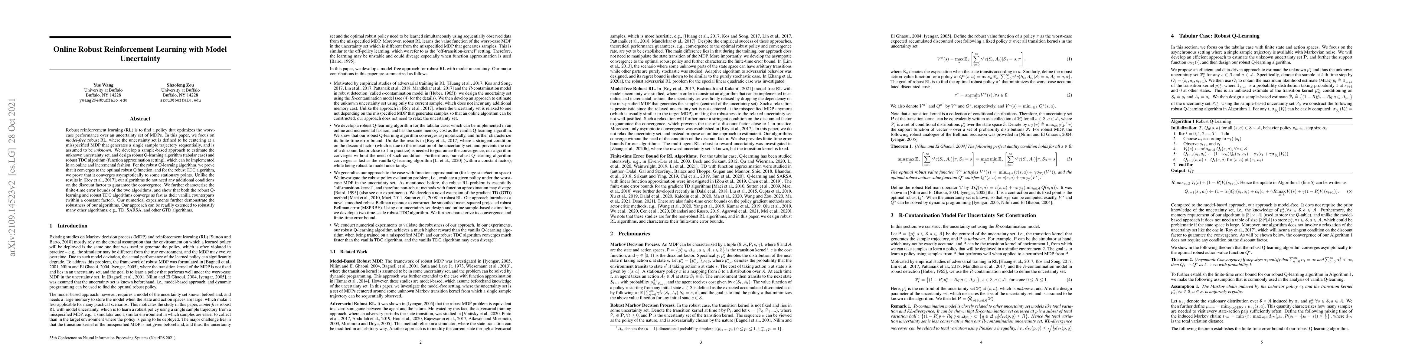 Robust reinforcement learning (RL) is to find a policy that optimizes the worst-case performance over an uncertainty set of MDPs. In this paper, we focus on model-free robust RL, where the uncertainty set is defined to be centering at a misspecified MDP that generates a single sample trajectory sequentially and is assumed to be unknown. We develop a sample-based approach to estimate the unknown uncertainty set and design a robust Q-learning algorithm (tabular case) and robust TDC algorithm (function approximation setting), which can be implemented in an online and incremental fashion. For the robust Q-learning algorithm, we prove that it converges to the optimal robust Q function, and for the robust TDC algorithm, we prove that it converges asymptotically to some stationary points. Unlike the results in [Roy et al., 2017], our algorithms do not need any additional conditions on the discount factor to guarantee the convergence. We further characterize the finite-time error bounds of the two algorithms and show that both the robust Q-learning and robust TDC algorithms converge as fast as their vanilla counterparts(within a constant factor). Our numerical experiments further demonstrate the robustness of our algorithms. Our approach can be readily extended to robustify many other algorithms, e.g., TD, SARSA, and other GTD algorithms.