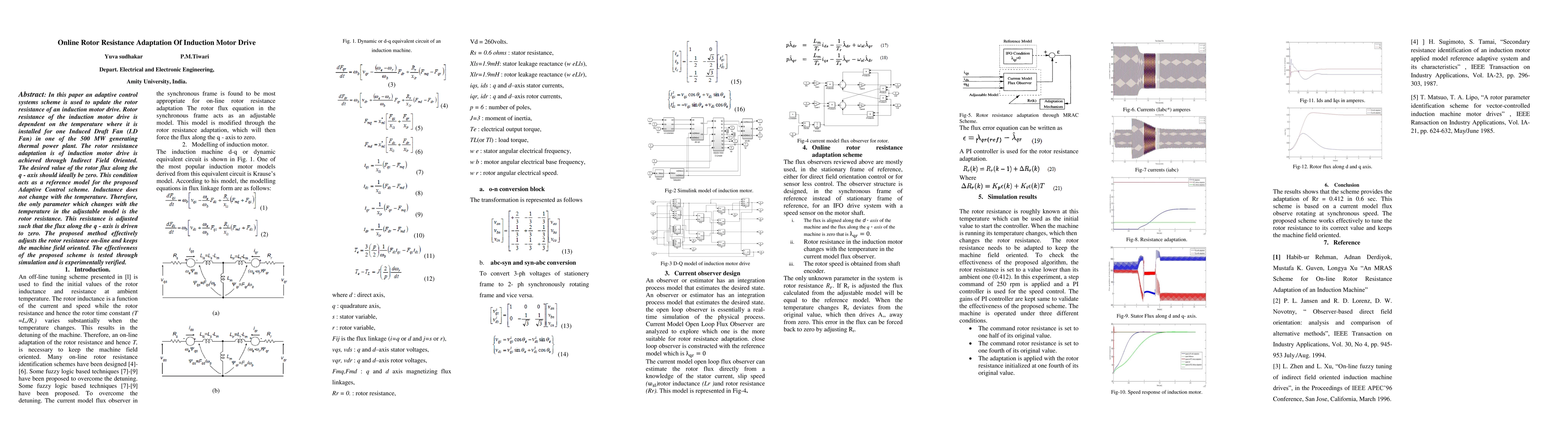 In this paper an adaptive control systems scheme is used to update the rotor resistance of an induction motor drive. Rotor resistance of the induction motor drive is dependent on the temperature where it is installed for one Induced Draft Fan (I.D Fan) in one of the 500 MW generating thermal power plant. The rotor resistance adaptation is of induction motor drive is achieved through Indirect Field Oriented. The desired value of the rotor flux along the q - axis should ideally be zero. This condition acts as a reference model for the proposed Adaptive Control scheme. Inductance does not change with the temperature. Therefore, the only parameter which changes with the temperature in the adjustable model is the rotor resistance. This resistance is adjusted such that the flux along the q - axis is driven to zero. The proposed method effectively adjusts the rotor resistance on-line and keeps the machine field oriented. The effectiveness of the proposed scheme is tested through simulation and is experimentally verified.
