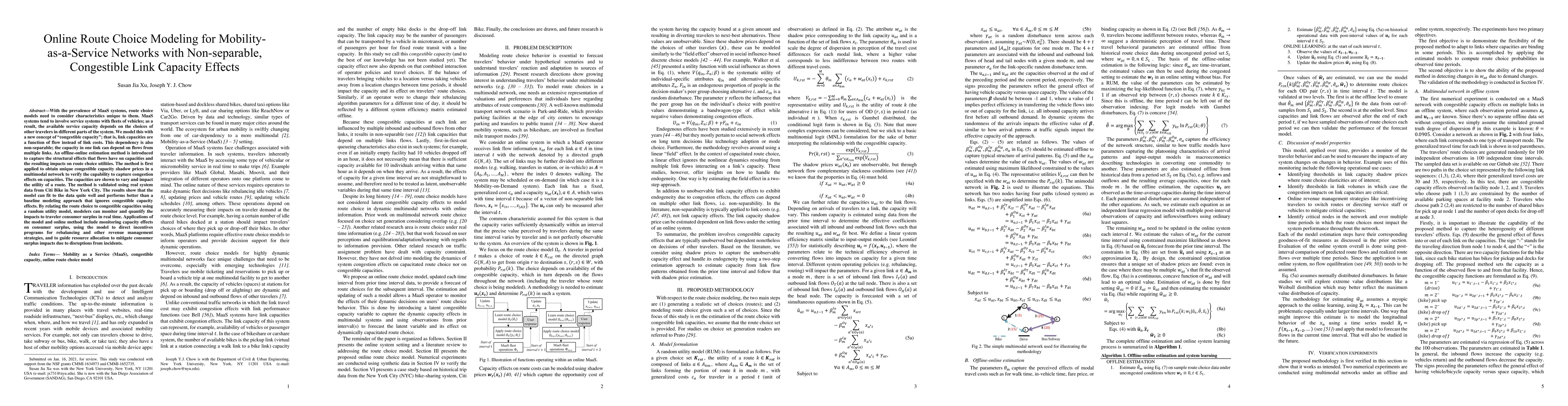With the prevalence of MaaS systems, route choice models need to consider characteristics unique to them. MaaS systems tend to involve service systems with fleets of vehicles; as a result, the available service capacity depends on the choices of other travelers in different parts of the system. We model this with a new concept of "congestible capacity"; that is, link capacities are a function of flow instead of link costs. This dependency is also non-separable; the capacity in one link can depend on flows from multiple links. An offline-online estimation method is introduced to capture the structural effects that flows have on capacities and the resulting impacts on route choice utilities. The method is first applied to obtain unique congestible capacity shadow prices in a multimodal network to verify the capability to capture congestion effects on capacities. The capacities are shown to vary and impact the utility of a route. The method is validated using real system data from Citi Bike in New York City. The results show that the model can fit to the data quite well and performs better than a baseline modeling approach that ignores congestible capacity effects. By relating the route choice to congestible capacities using a random utility model, modelers can monitor and quantify the impacts to traveler consumer surplus in real time. Applications of the model and online method include monitoring capacity effects on consumer surplus, using the model to direct incentives programs for rebalancing and other revenue management strategies, and to guide resource allocation to mitigate consumer surplus impacts due to disruptions from incidents.