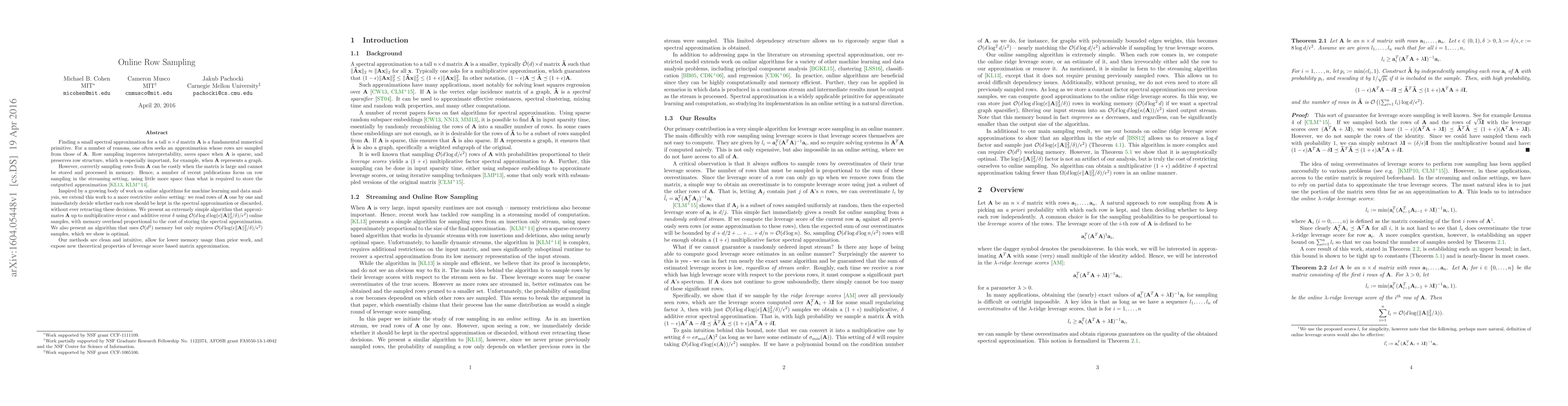 Finding a small spectral approximation for a tall $n \times d$ matrix $A$ is a fundamental numerical primitive. For a number of reasons, one often seeks an approximation whose rows are sampled from those of $A$. Row sampling improves interpretability, saves space when $A$ is sparse, and preserves row structure, which is especially important, for example, when $A$ represents a graph. However, correctly sampling rows from $A$ can be costly when the matrix is large and cannot be stored and processed in memory. Hence, a number of recent publications focus on row sampling in the streaming setting, using little more space than what is required to store the outputted approximation [KL13, KLM+14]. Inspired by a growing body of work on online algorithms for machine learning and data analysis, we extend this work to a more restrictive online setting: we read rows of $A$ one by one and immediately decide whether each row should be kept in the spectral approximation or discarded, without ever retracting these decisions. We present an extremely simple algorithm that approximates $A$ up to multiplicative error $\epsilon$ and additive error $\delta$ using $O(d \log d \log(\epsilon||A||_2/\delta)/\epsilon^2)$ online samples, with memory overhead proportional to the cost of storing the spectral approximation. We also present an algorithm that uses $O(d^2$) memory but only requires $O(d\log(\epsilon||A||_2/\delta)/\epsilon^2)$ samples, which we show is optimal. Our methods are clean and intuitive, allow for lower memory usage than prior work, and expose new theoretical properties of leverage score based matrix approximation.