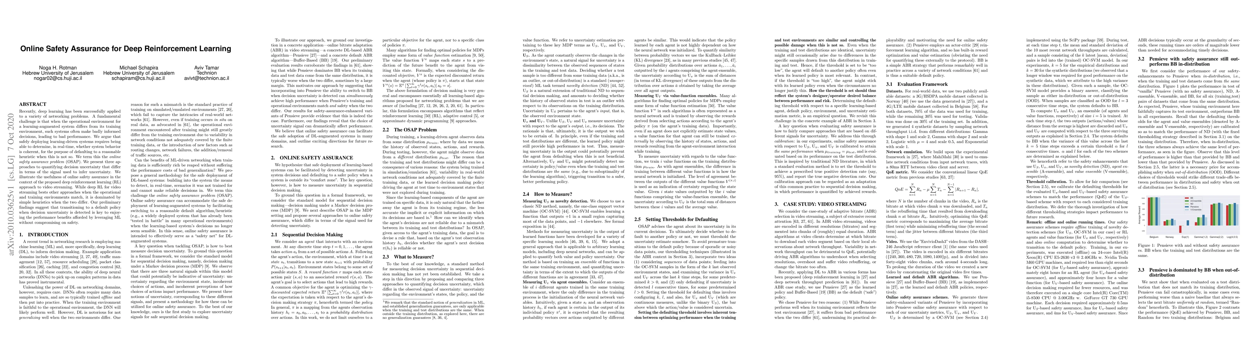 Recently, deep learning has been successfully applied to a variety of networking problems. A fundamental challenge is that when the operational environment for a learning-augmented system differs from its training environment, such systems often make badly informed decisions, leading to bad performance. We argue that safely deploying learning-driven systems requires being able to determine, in real time, whether system behavior is coherent, for the purpose of defaulting to a reasonable heuristic when this is not so. We term this the online safety assurance problem (OSAP). We present three approaches to quantifying decision uncertainty that differ in terms of the signal used to infer uncertainty. We illustrate the usefulness of online safety assurance in the context of the proposed deep reinforcement learning (RL) approach to video streaming. While deep RL for video streaming bests other approaches when the operational and training environments match, it is dominated by simple heuristics when the two differ. Our preliminary findings suggest that transitioning to a default policy when decision uncertainty is detected is key to enjoying the performance benefits afforded by leveraging ML without compromising on safety.