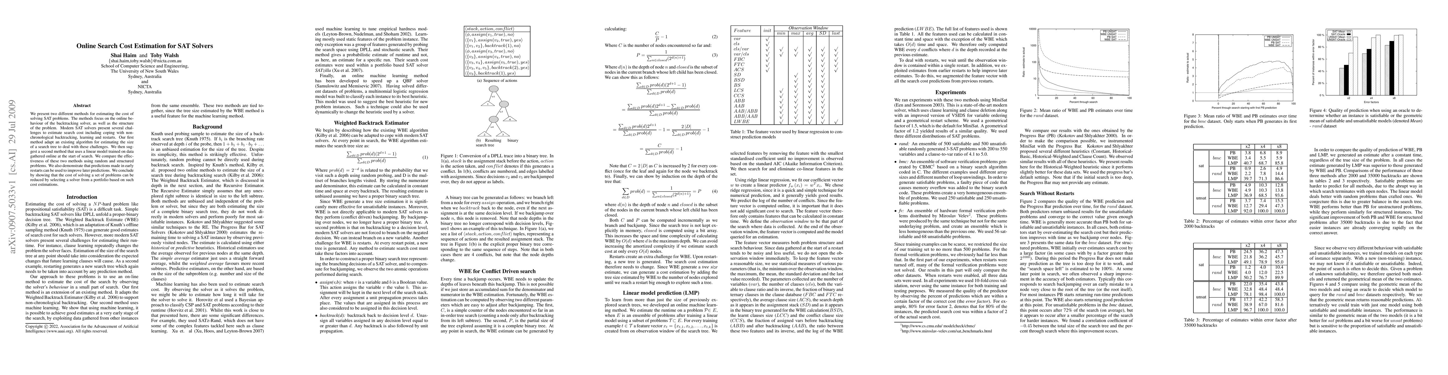 This paper proposes two methods for estimating the search cost of SAT solvers, focusing on online behavior and problem structure. The first method adapts an existing algorithm for search tree size estimation to handle modern SAT solver challenges. The second method employs a linear model trained on early search data. Both methods are compared against random and structured problems, demonstrating their effectiveness and potential to reduce solving costs by selecting solvers from a portfolio based on these estimations.