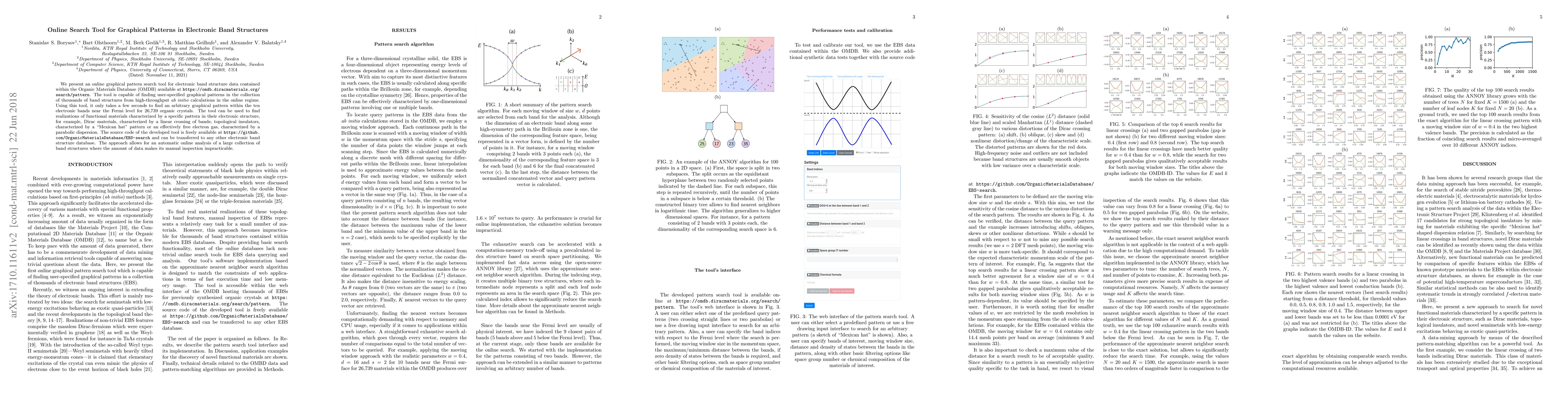 We present an online graphical pattern search tool for electronic band structure data contained within the Organic Materials Database (OMDB) available at https://omdb.diracmaterials.org/search/pattern. The tool is capable of finding user-specified graphical patterns in the collection of thousands of band structures from high-throughput ab initio calculations in the online regime. Using this tool, it only takes a few seconds to find an arbitrary graphical pattern within the ten electronic bands near the Fermi level for 26,739 organic crystals. The tool can be used to find realizations of functional materials characterized by a specific pattern in their electronic structure, for example, Dirac materials, characterized by a linear crossing of bands; topological insulators, characterized by a "Mexican hat" pattern or an effectively free electron gas, characterized by a parabolic dispersion. The source code of the developed tool is freely available at https://github.com/OrganicMaterialsDatabase/EBS-search and can be transferred to any other electronic band structure database. The approach allows for an automatic online analysis of a large collection of band structures where the amount of data makes its manual inspection impracticable.