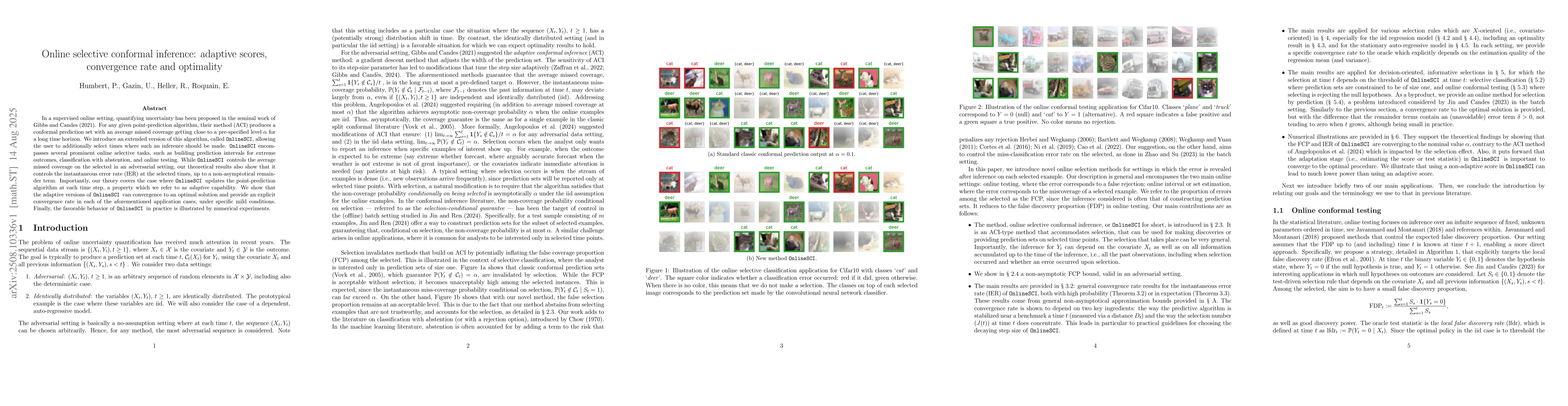 In a supervised online setting, quantifying uncertainty has been proposed in the seminal work of \cite{gibbs2021adaptive}. For any given point-prediction algorithm, their method (ACI) produces a conformal prediction set with an average missed coverage getting close to a pre-specified level $\alpha$ for a long time horizon. We introduce an extended version of this algorithm, called OnlineSCI, allowing the user to additionally select times where such an inference should be made. OnlineSCI encompasses several prominent online selective tasks, such as building prediction intervals for extreme outcomes, classification with abstention, and online testing. While OnlineSCI controls the average missed coverage on the selected in an adversarial setting, our theoretical results also show that it controls the instantaneous error rate (IER) at the selected times, up to a non-asymptotical remainder term. Importantly, our theory covers the case where OnlineSCI updates the point-prediction algorithm at each time step, a property which we refer to as {\it adaptive} capability. We show that the adaptive versions of OnlineSCI can convergence to an optimal solution and provide an explicit convergence rate in each of the aforementioned application cases, under specific mild conditions. Finally, the favorable behavior of OnlineSCI in practice is illustrated by numerical experiments.