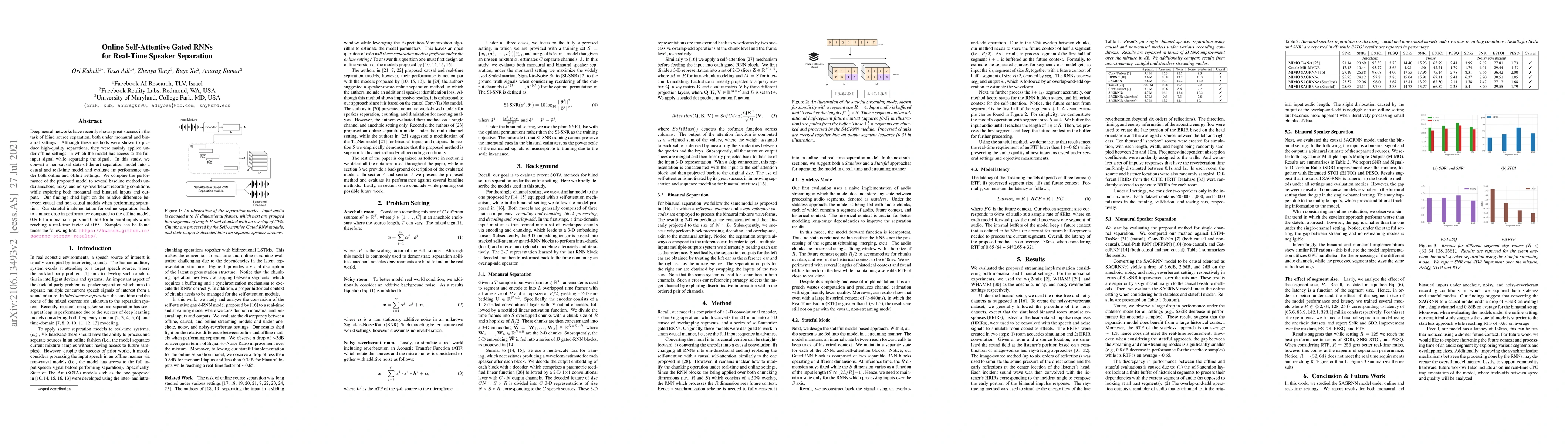Researchers converted a non-causal separation model to a causal, real-time model for online speaker separation, showing minor performance drops with 0.8dB loss in monaural and 0.3dB in binaural settings, while achieving real-time capabilities.