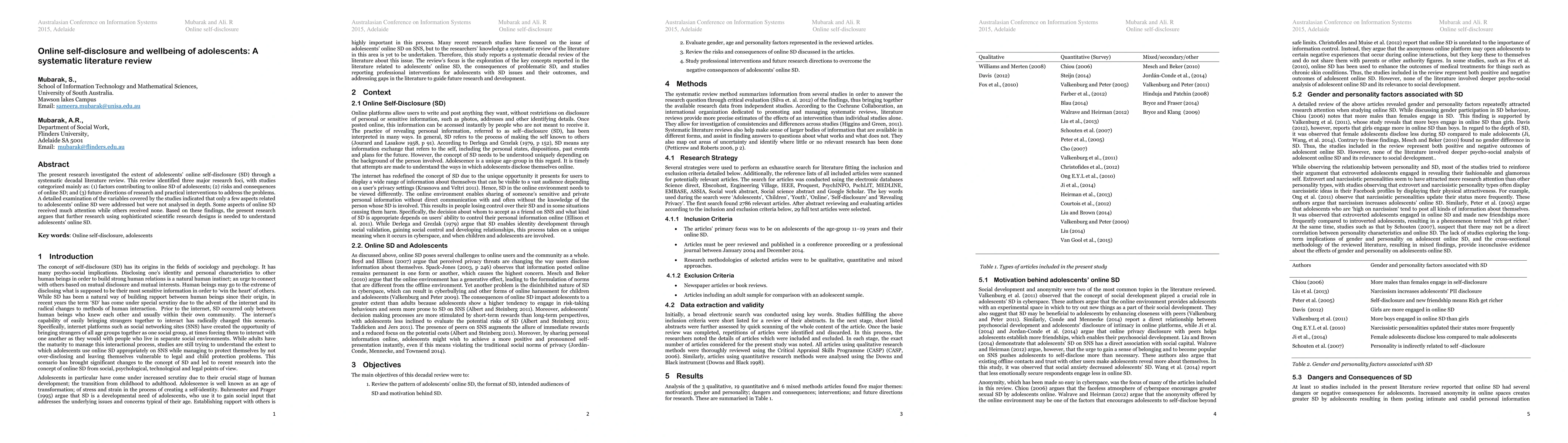 The present research investigated the extent of online self-disclosure (SD) of adolescents through a systematic decadal literature review. This review identified three major areas of research focus, with studies categorized mainly as: (1) factors contributing to online SD of adolescents; (2) risks and consequences of online SD; and (3) future directions of research and practical interventions to address the problems. A detailed examination of the variables covered by the studies indicated that only a few aspects related to adolescents' online SD were addressed and these variables did not receive in-depth analysis. Some aspects of online SD received too much attention while others received none. Based on these findings, the present research argues that further research using sophisticated scientific research designs is needed to understand adolescents' online SD.