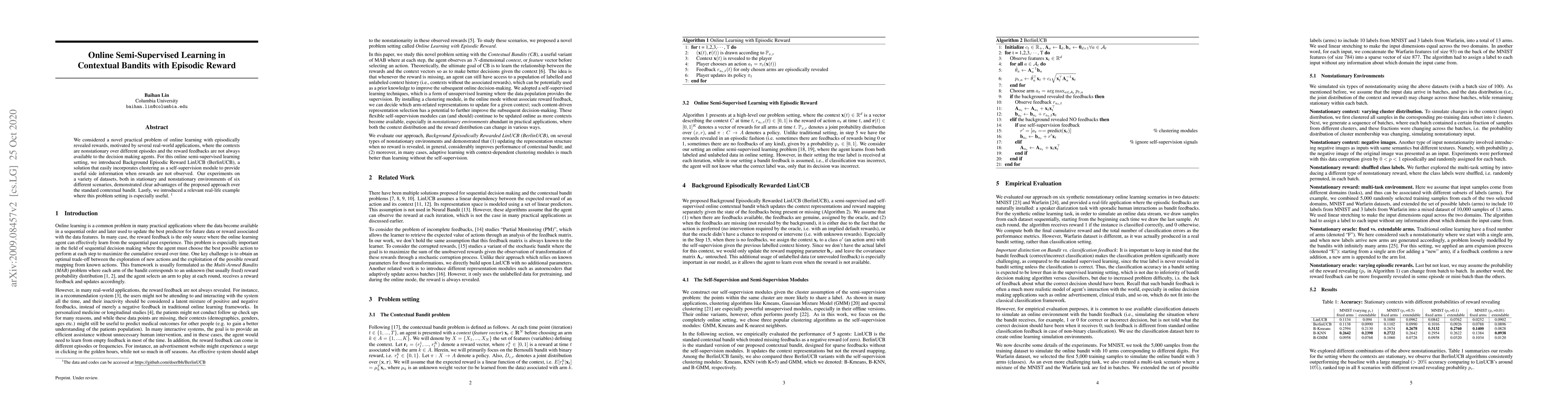 We considered a novel practical problem of online learning with episodically revealed rewards, motivated by several real-world applications, where the contexts are nonstationary over different episodes and the reward feedbacks are not always available to the decision making agents. For this online semi-supervised learning setting, we introduced Background Episodic Reward LinUCB (BerlinUCB), a solution that easily incorporates clustering as a self-supervision module to provide useful side information when rewards are not observed. Our experiments on a variety of datasets, both in stationary and nonstationary environments of six different scenarios, demonstrated clear advantages of the proposed approach over the standard contextual bandit. Lastly, we introduced a relevant real-life example where this problem setting is especially useful.
