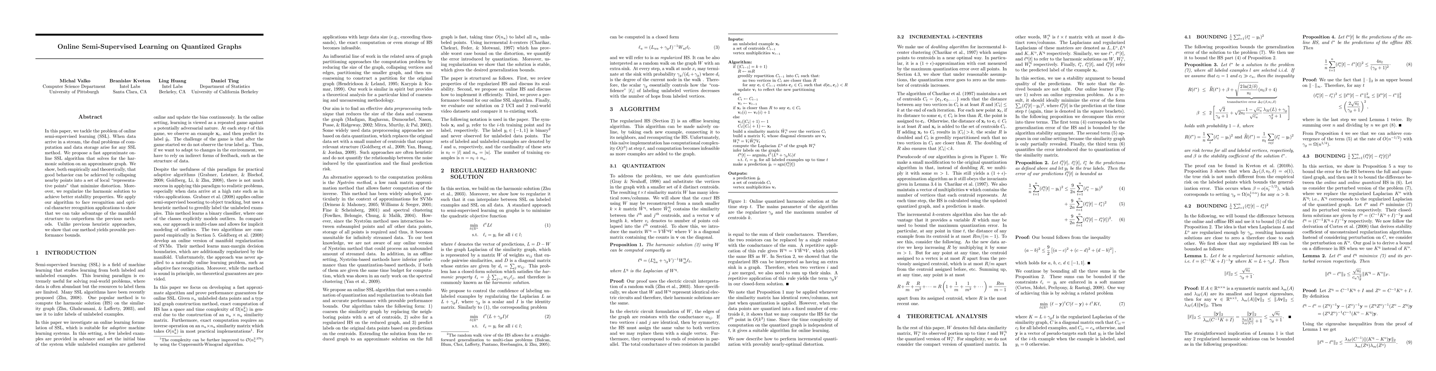 This paper proposes a fast online semi-supervised learning algorithm for streaming data on quantized graphs, achieving good performance through representative point selection and regularization. The method demonstrates superior results in face recognition and optical character recognition, with provable performance guarantees.
