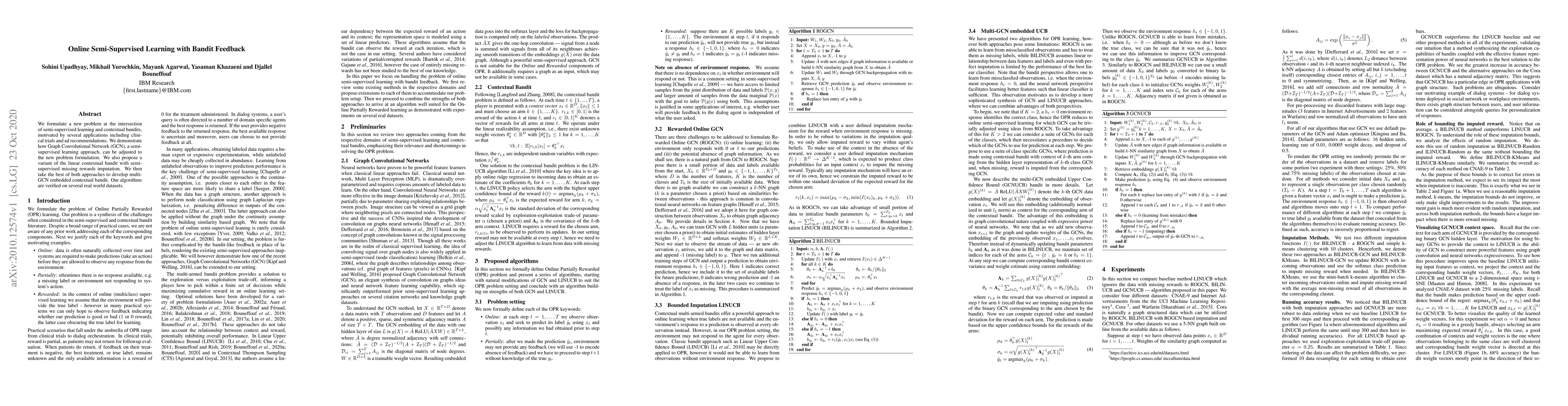 We formulate a new problem at the intersectionof semi-supervised learning and contextual bandits,motivated by several applications including clini-cal trials and ad recommendations. We demonstratehow Graph Convolutional Network (GCN), a semi-supervised learning approach, can be adjusted tothe new problem formulation. We also propose avariant of the linear contextual bandit with semi-supervised missing rewards imputation. We thentake the best of both approaches to develop multi-GCN embedded contextual bandit. Our algorithmsare verified on several real world datasets.
