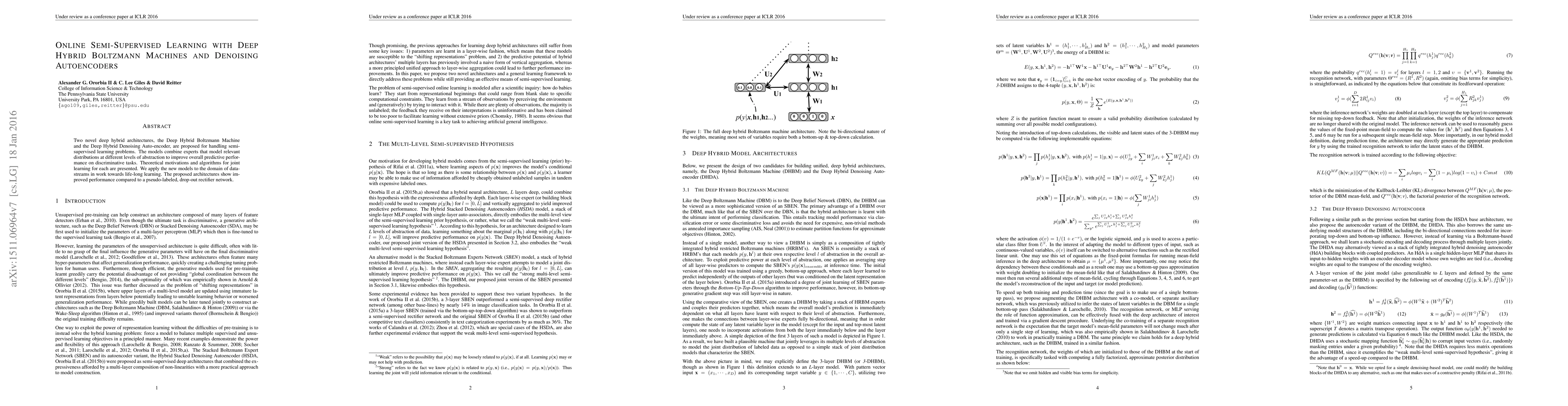 This paper proposes two deep hybrid architectures—Deep Hybrid Boltzmann Machines and Deep Hybrid Denoising Autoencoders—for semi-supervised learning, combining different abstraction levels to enhance predictive performance. The models demonstrate superior results in data-stream applications for life-long learning compared to a pseudo-labeled dropout rectifier network.