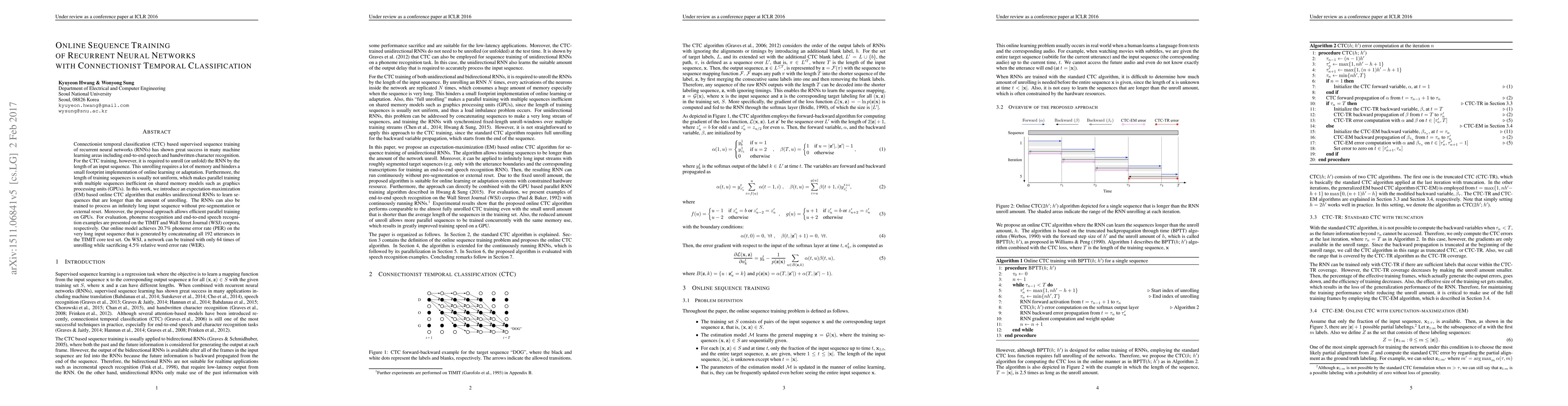 This research introduces an online training algorithm for recurrent neural networks (RNNs) using Connectionist Temporal Classification (CTC) that overcomes memory limitations and inefficiencies in parallel training. The proposed expectation-maximization (EM) based approach enables RNNs to handle sequences longer than their unrolling length and supports efficient GPU training. Evaluations on TIMIT and WSJ corpora demonstrate the effectiveness of the method.
