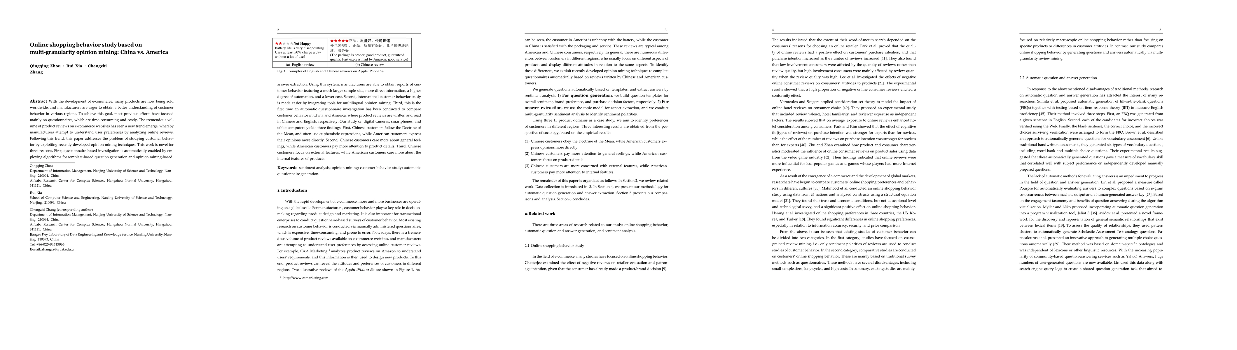 With the development of e-commerce, many products are now being sold worldwide, and manufacturers are eager to obtain a better understanding of customer behavior in various regions. To achieve this goal, most previous efforts have focused mainly on questionnaires, which are time-consuming and costly. The tremendous volume of product reviews on e-commerce websites has seen a new trend emerge, whereby manufacturers attempt to understand user preferences by analyzing online reviews. Following this trend, this paper addresses the problem of studying customer behavior by exploiting recently developed opinion mining techniques. This work is novel for three reasons. First, questionnaire-based investigation is automatically enabled by employing algorithms for template-based question generation and opinion mining-based answer extraction. Using this system, manufacturers are able to obtain reports of customer behavior featuring a much larger sample size, more direct information, a higher degree of automation, and a lower cost. Second, international customer behavior study is made easier by integrating tools for multilingual opinion mining. Third, this is the first time an automatic questionnaire investigation has been conducted to compare customer behavior in China and America, where product reviews are written and read in Chinese and English, respectively. Our study on digital cameras, smartphones, and tablet computers yields three findings. First, Chinese customers follow the Doctrine of the Mean, and often use euphemistic expressions, while American customers express their opinions more directly. Second, Chinese customers care more about general feelings, while American customers pay more attention to product details. Third, Chinese customers focus on external features, while American customers care more about the internal features of products.