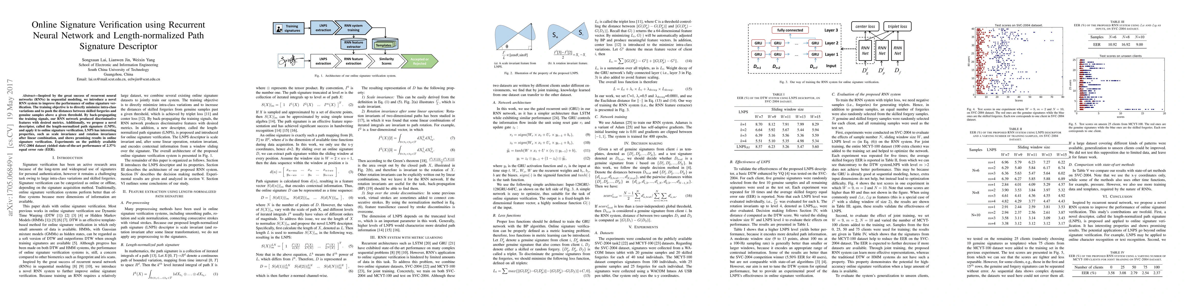 This paper proposes an RNN system for online signature verification that minimizes intra-class variations and enhances the distance between genuine and forged signatures. It introduces a length-normalized path signature (LNPS) descriptor, which demonstrates scale and rotation invariance, achieving a state-of-the-art EER of 2.37% on the SVC-2004 dataset.