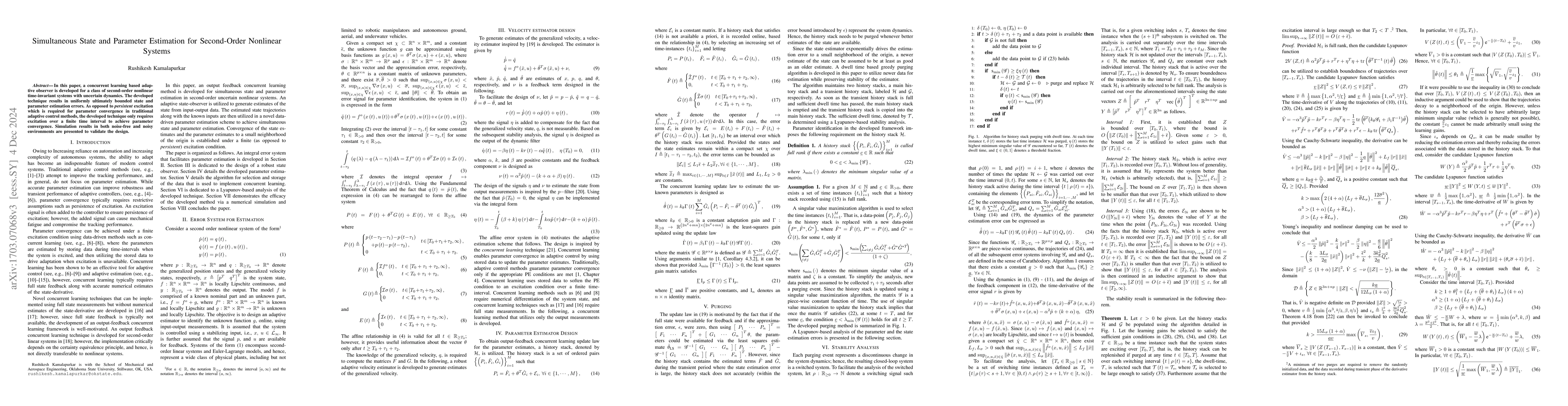 In this paper, a concurrent learning based adaptive observer is developed for a class of second-order nonlinear time-invariant systems with uncertain dynamics. The developed technique results in uniformly ultimately bounded state and parameter estimation errors. As opposed to persistent excitation which is required for parameter convergence in traditional adaptive control methods, the developed technique only requires excitation over a finite time interval to achieve parameter convergence. Simulation results in both noise-free and noisy environments are presented to validate the design.