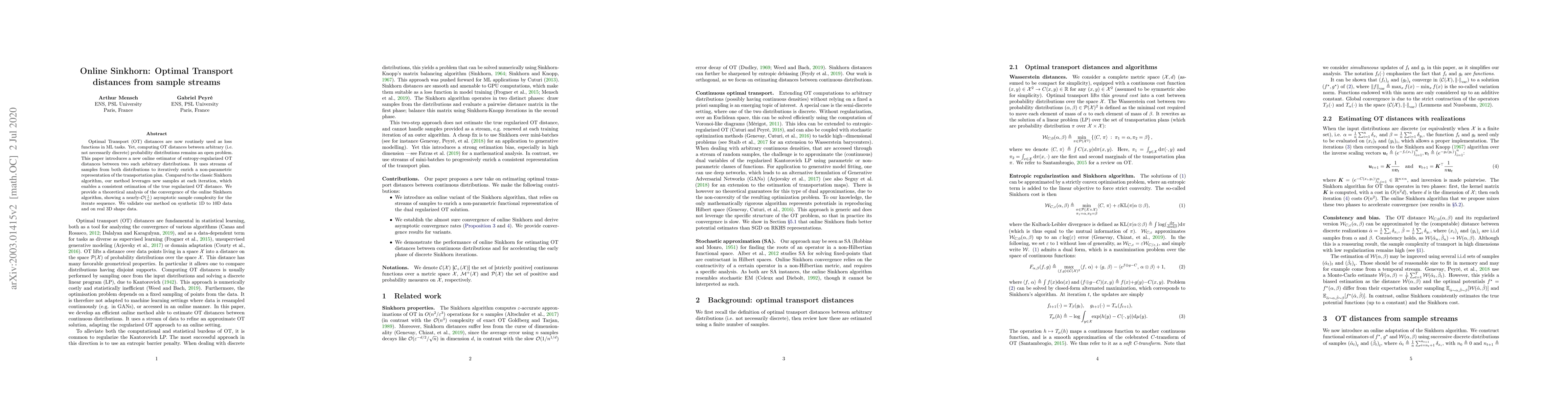 Optimal Transport (OT) distances are now routinely used as loss functions in ML tasks. Yet, computing OT distances between arbitrary (i.e. not necessarily discrete) probability distributions remains an open problem. This paper introduces a new online estimator of entropy-regularized OT distances between two such arbitrary distributions. It uses streams of samples from both distributions to iteratively enrich a non-parametric representation of the transportation plan. Compared to the classic Sinkhorn algorithm, our method leverages new samples at each iteration, which enables a consistent estimation of the true regularized OT distance. We provide a theoretical analysis of the convergence of the online Sinkhorn algorithm, showing a nearly-O(1/n) asymptotic sample complexity for the iterate sequence. We validate our method on synthetic 1D to 10D data and on real 3D shape data.