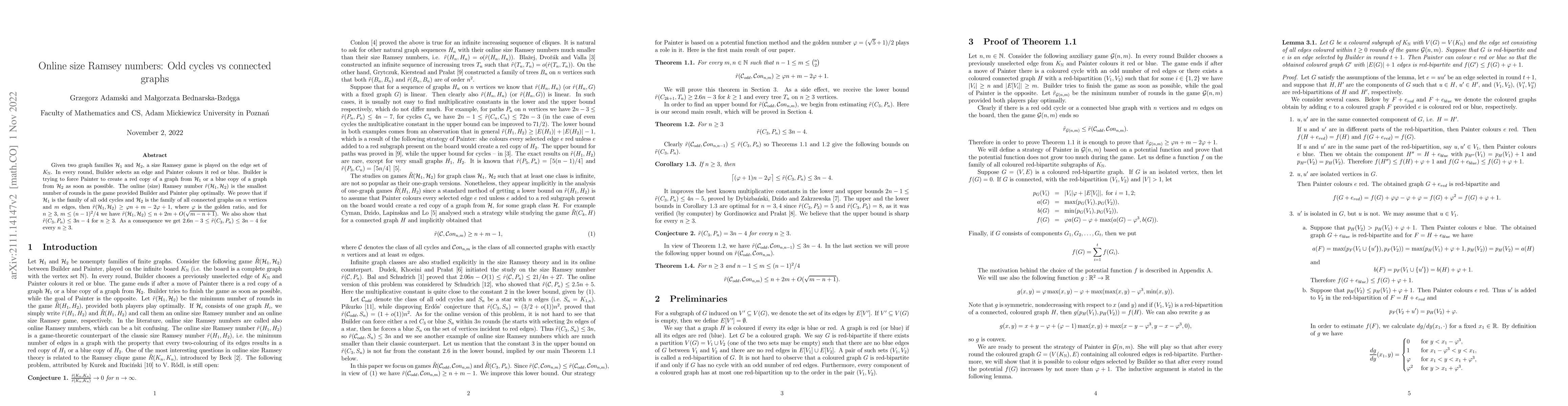 Given two graph families $\mathcal H_1$ and $\mathcal H_2$, a size Ramsey game is played on the edge set of $K_\mathbb{N}$. In every round, Builder selects an edge and Painter colours it red or blue. Builder is trying to force Painter to create as soon as possible a red copy of a graph from $\mathcal H_1$ or a blue copy of a graph from $\mathcal H_2$. The online (size) Ramsey number $\tilde{r}(\mathcal H_1,\mathcal H_2)$ is the smallest number of rounds in the game provided Builder and Painter play optimally. We prove that if $\mathcal H_1$ is the family of all odd cycles and $\mathcal H_2$ is the family of all connected graphs on $n$ vertices and $m$ edges, then $\tilde{r}(\mathcal H_1,\mathcal H_2)\ge \varphi n + m-2\varphi+1$, where $\varphi$ is the golden ratio, and for $n\ge 3$, $m\le (n-1)^2/4$ we have $\tilde{r}(\mathcal H_1,\mathcal H_2)\le n+2m+O(\sqrt{m-n+1})$. We also show that $\tilde{r}(C_3,P_n)\le 3n-4$ for $n\ge 3$. As a consequence we get $2.6n-3\le \tilde{r}(C_3,P_n)\le 3n-4$ for every $n\ge 3$.