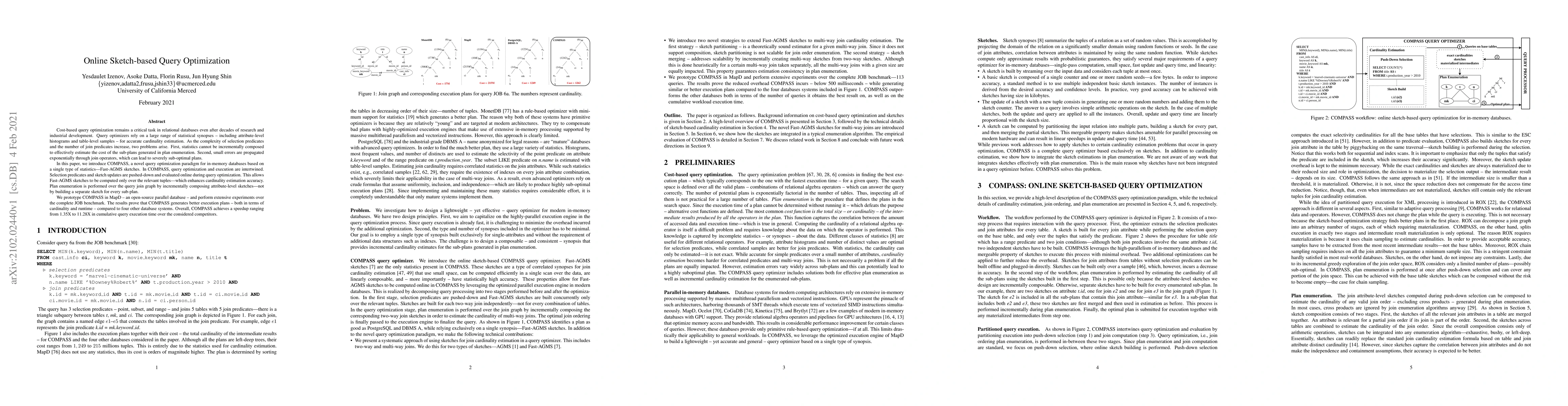 Cost-based query optimization remains a critical task in relational databases even after decades of research and industrial development. Query optimizers rely on a large range of statistical synopses -- including attribute-level histograms and table-level samples -- for accurate cardinality estimation. As the complexity of selection predicates and the number of join predicates increase, two problems arise. First, statistics cannot be incrementally composed to effectively estimate the cost of the sub-plans generated in plan enumeration. Second, small errors are propagated exponentially through join operators, which can lead to severely sub-optimal plans. In this paper, we introduce COMPASS, a novel query optimization paradigm for in-memory databases based on a single type of statistics -- Fast-AGMS sketches. In COMPASS, query optimization and execution are intertwined. Selection predicates and sketch updates are pushed-down and evaluated online during query optimization. This allows Fast-AGMS sketches to be computed only over the relevant tuples -- which enhances cardinality estimation accuracy. Plan enumeration is performed over the query join graph by incrementally composing attribute-level sketches -- not by building a separate sketch for every sub-plan. We prototype COMPASS in MapD -- an open-source parallel database -- and perform extensive experiments over the complete JOB benchmark. The results prove that COMPASS generates better execution plans -- both in terms of cardinality and runtime -- compared to four other database systems. Overall, COMPASS achieves a speedup ranging from 1.35X to 11.28X in cumulative query execution time over the considered competitors.