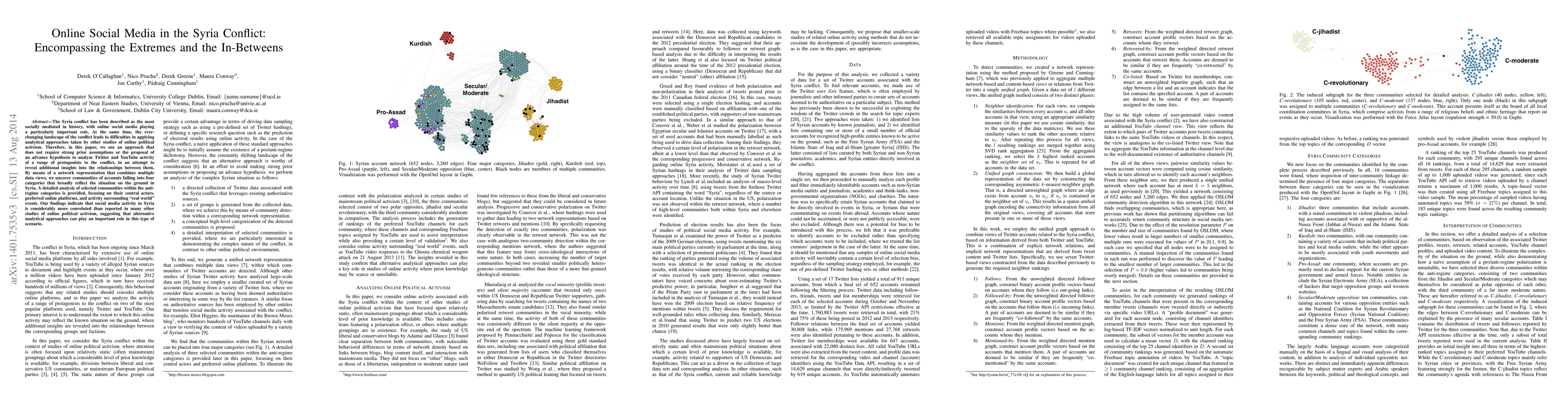 The Syria conflict has been described as the most socially mediated in history, with online social media playing a particularly important role. At the same time, the ever-changing landscape of the conflict leads to difficulties in applying analytical approaches taken by other studies of online political activism. Therefore, in this paper, we use an approach that does not require strong prior assumptions or the proposal of an advance hypothesis to analyze Twitter and YouTube activity of a range of protagonists to the conflict, in an attempt to reveal additional insights into the relationships between them. By means of a network representation that combines multiple data views, we uncover communities of accounts falling into four categories that broadly reflect the situation on the ground in Syria. A detailed analysis of selected communities within the anti-regime categories is provided, focusing on their central actors, preferred online platforms, and activity surrounding "real world" events. Our findings indicate that social media activity in Syria is considerably more convoluted than reported in many other studies of online political activism, suggesting that alternative analytical approaches can play an important role in this type of scenario.