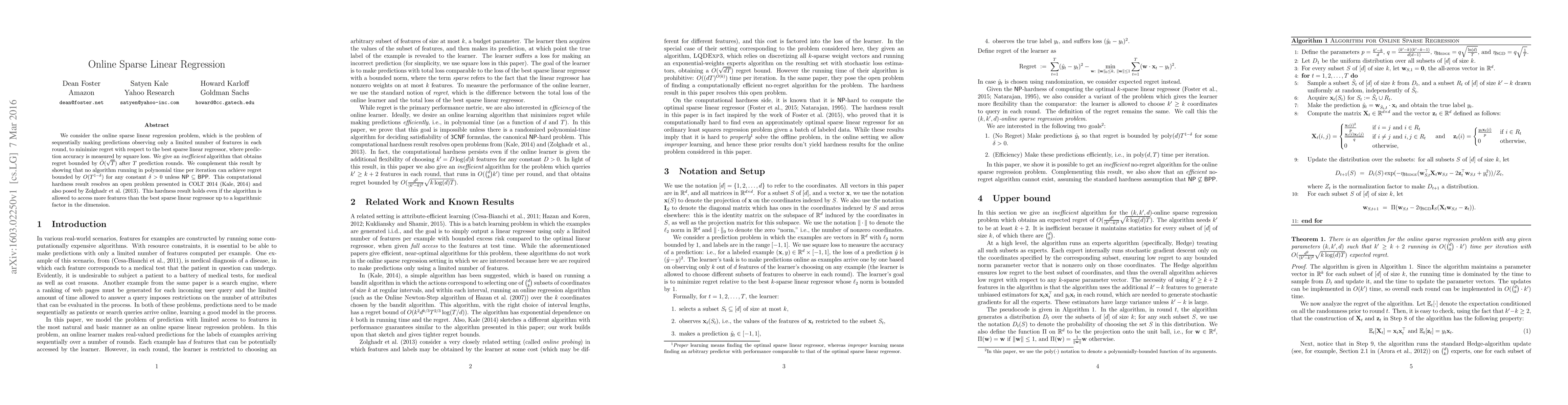 Researchers developed an algorithm for online sparse linear regression with regret bounded by π(℞(T)) after T prediction rounds. However, they also showed that no efficient algorithms exist to achieve better bounds unless P = NP.