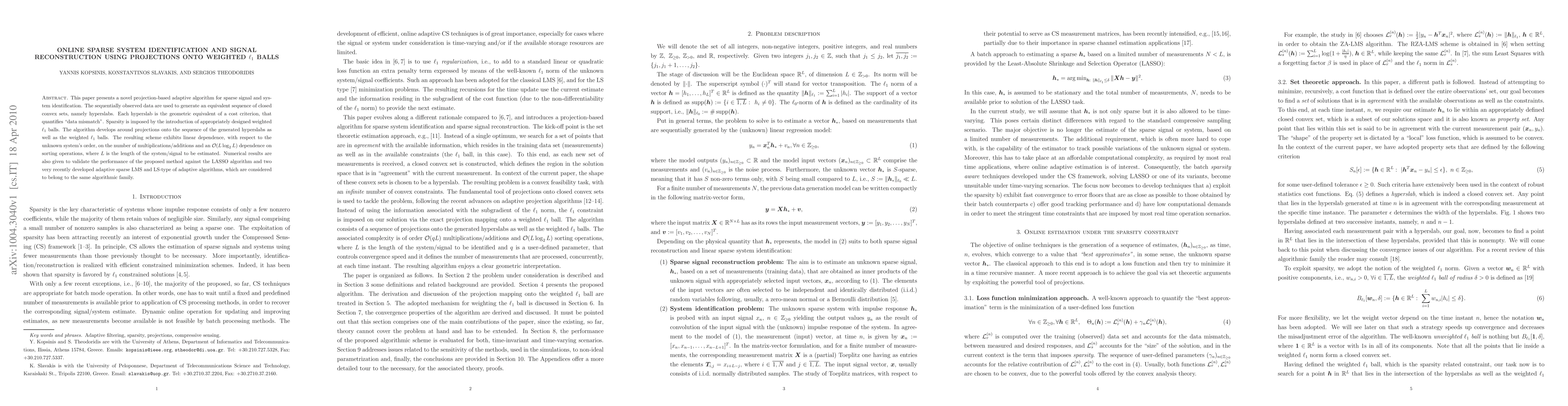 This paper introduces a projection-based adaptive algorithm for sparse signal and system identification using weighted $\ell_1$ balls. It leverages sequentially observed data to generate hyperslabs, projecting onto these sets to achieve efficient signal reconstruction, demonstrating linear complexity in system order and logarithmic complexity in sorting operations.