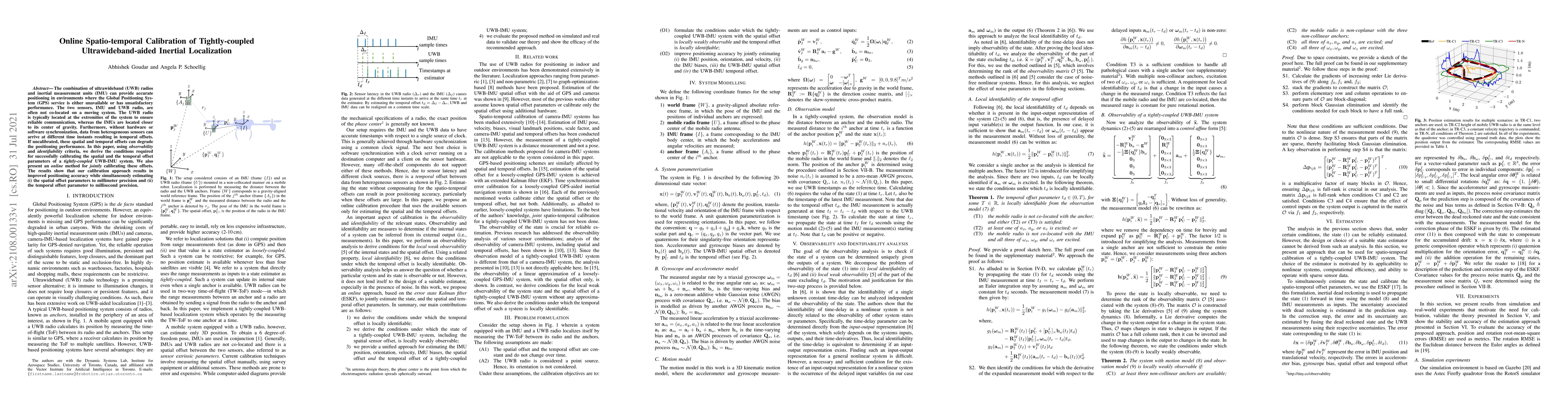 This paper proposes an online method for calibrating spatial and temporal offsets in a tightly-coupled ultrawideband (UWB)-aided inertial localization system, improving positioning accuracy by estimating spatial offsets to millimeter precision and temporal offsets to millisecond precision. The method leverages observability and identifiability criteria to achieve precise calibration without hardware or software synchronization.