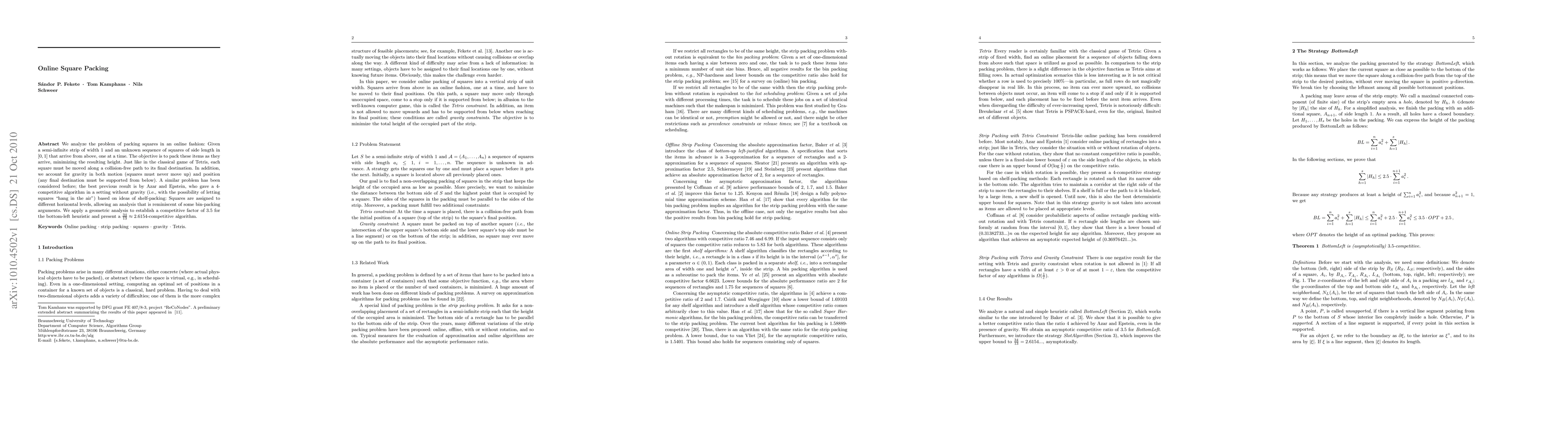 This paper studies the online square packing problem where squares of side length [0,1] arrive sequentially and must be packed in a strip of width 1 while minimizing the resulting height, considering gravity constraints. The authors propose a bottom-left heuristic with a competitive factor of 3.5 and a new algorithm achieving a competitive factor of 2.615.