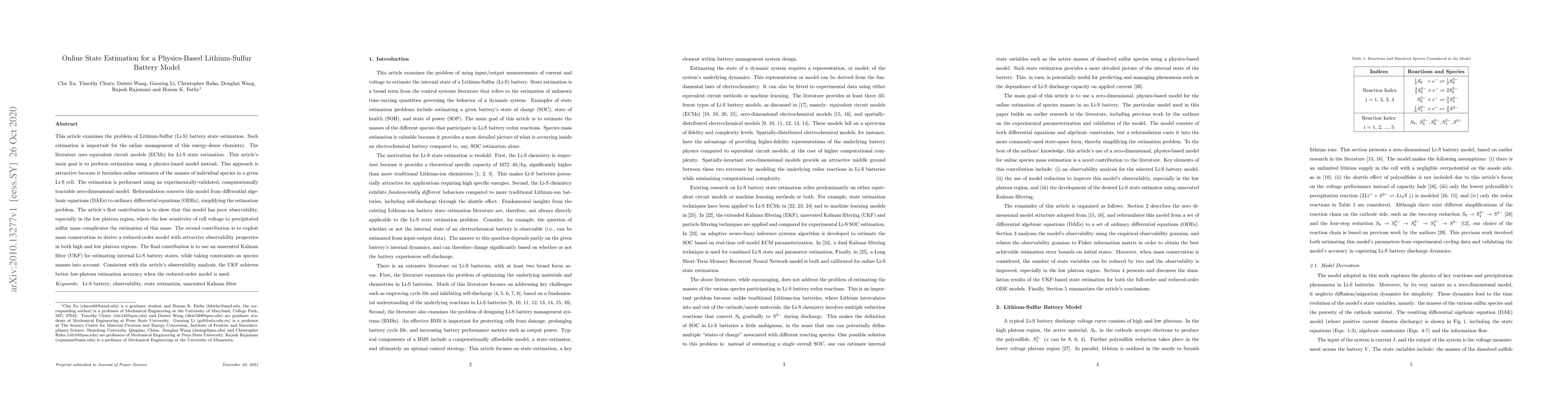 This paper proposes an online state estimation method for a physics-based lithium-sulfur battery model, addressing the challenge of estimating internal states using a reduced-order model that improves observability. The unscented Kalman filter (UKF) achieves better accuracy, especially in low plateau regions, by incorporating mass conservation and constraints on species masses.