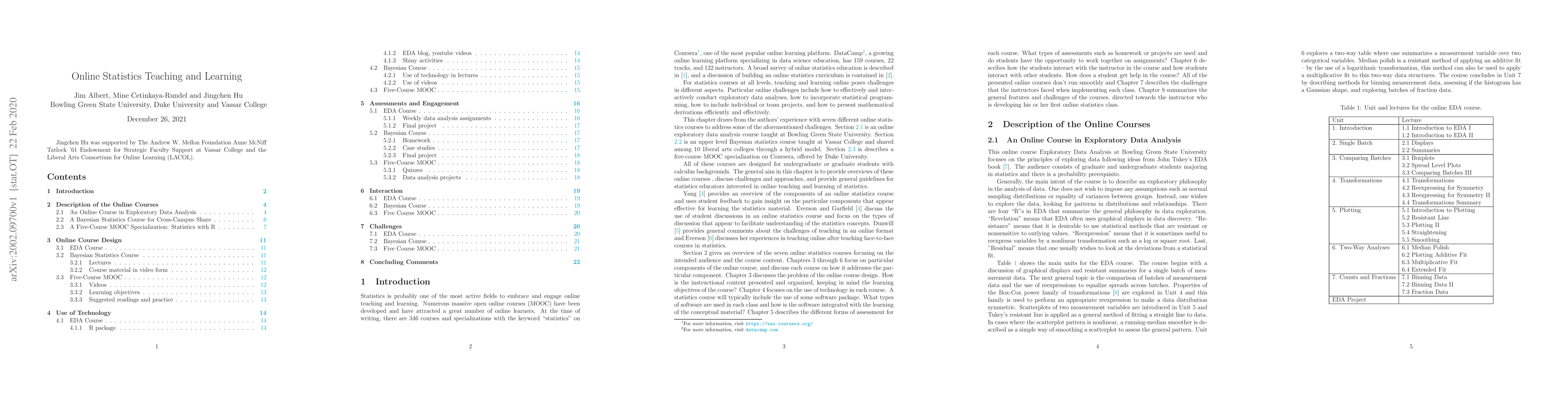 For statistics courses at all levels, teaching and learning online poses challenges in different aspects. Particular online challenges include how to effectively and interactively conduct exploratory data analyses, how to incorporate statistical programming, how to include individual or team projects, and how to present mathematical derivations efficiently and effectively. This article draws from the authors' experience with seven different online statistics courses to address some of the aforementioned challenges. One course is an online exploratory data analysis course taught at Bowling Green State University. A second course is an upper level Bayesian statistics course taught at Vassar College and shared among 10 liberal arts colleges through a hybrid model. We alo describes a five-course MOOC specialization on Coursera, offered by Duke University.