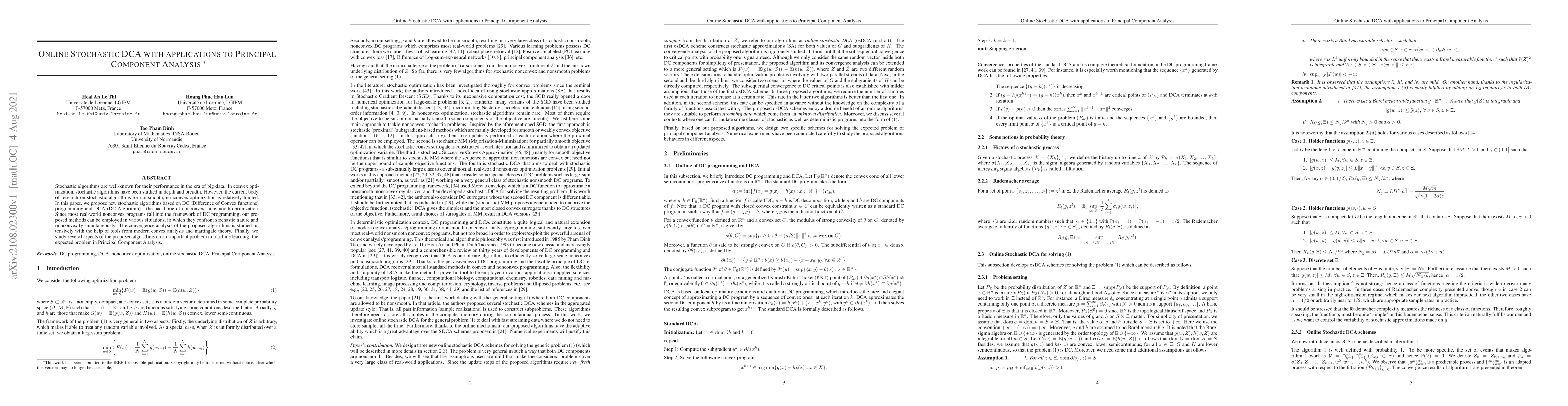 This paper introduces new stochastic algorithms based on DC programming and DCA for nonconvex, nonsmooth optimization, with a focus on their application to Principal Component Analysis in machine learning. The algorithms' convergence is rigorously analyzed using modern convex analysis and martingale theory.
