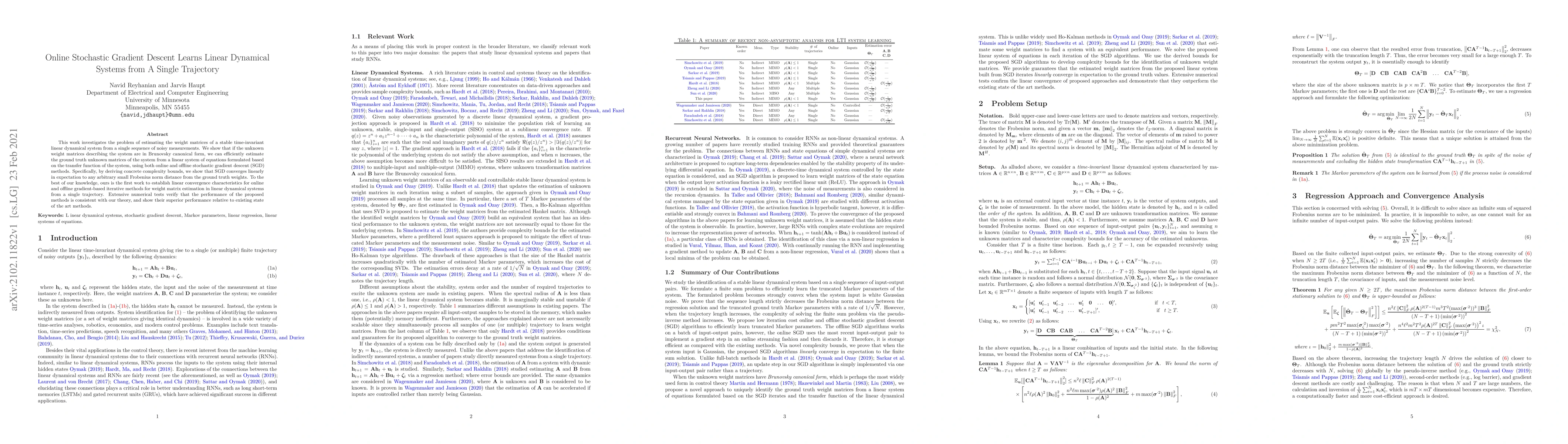 This paper proposes online and offline stochastic gradient descent methods to estimate weight matrices of linear dynamical systems from a single noisy trajectory, demonstrating linear convergence and superior performance compared to existing methods. Numerical tests confirm the theoretical findings and the effectiveness of the proposed approach.