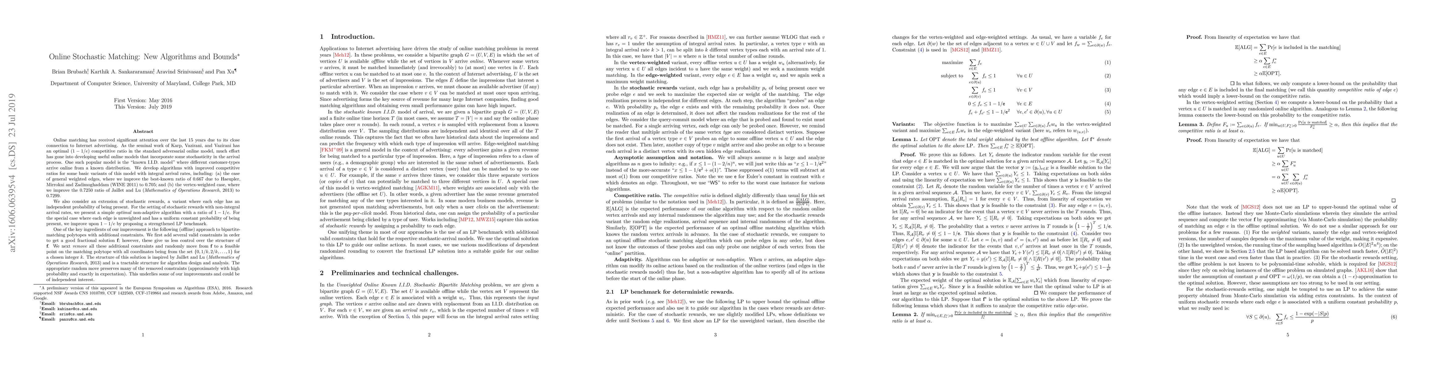 Online matching has received significant attention over the last 15 years due to its close connection to Internet advertising. As the seminal work of Karp, Vazirani, and Vazirani has an optimal (1 - 1/e) competitive ratio in the standard adversarial online model, much effort has gone into developing useful online models that incorporate some stochasticity in the arrival process. One such popular model is the "known I.I.D. model" where different customer-types arrive online from a known distribution. We develop algorithms with improved competitive ratios for some basic variants of this model with integral arrival rates, including (a) the case of general weighted edges, where we improve the best-known ratio of 0.667 due to Haeupler, Mirrokni and Zadimoghaddam to 0.705; and (b) the vertex-weighted case, where we improve the 0.7250 ratio of Jaillet and Lu to 0.7299. We also consider an extension of stochastic rewards, a variant where each edge has an independent probability of being present. For the setting of stochastic rewards with non-integral arrival rates, we present a simple optimal non-adaptive algorithm with a ratio of 1 - 1/e. For the special case where each edge is unweighted and has a uniform constant probability of being present, we improve upon 1 - 1/e by proposing a strengthened LP benchmark.