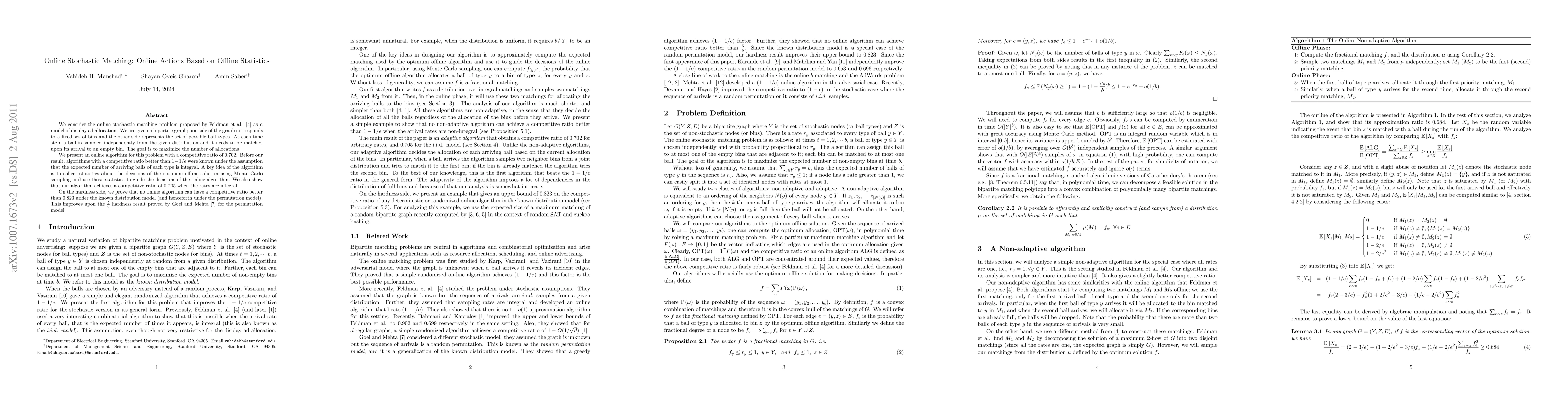 This paper presents an online algorithm for the stochastic matching problem, achieving a competitive ratio of 0.702 by leveraging offline statistics collected via Monte Carlo sampling. It also establishes a lower bound of 0.823 for any online algorithm under the known distribution model, improving previous hardness results.