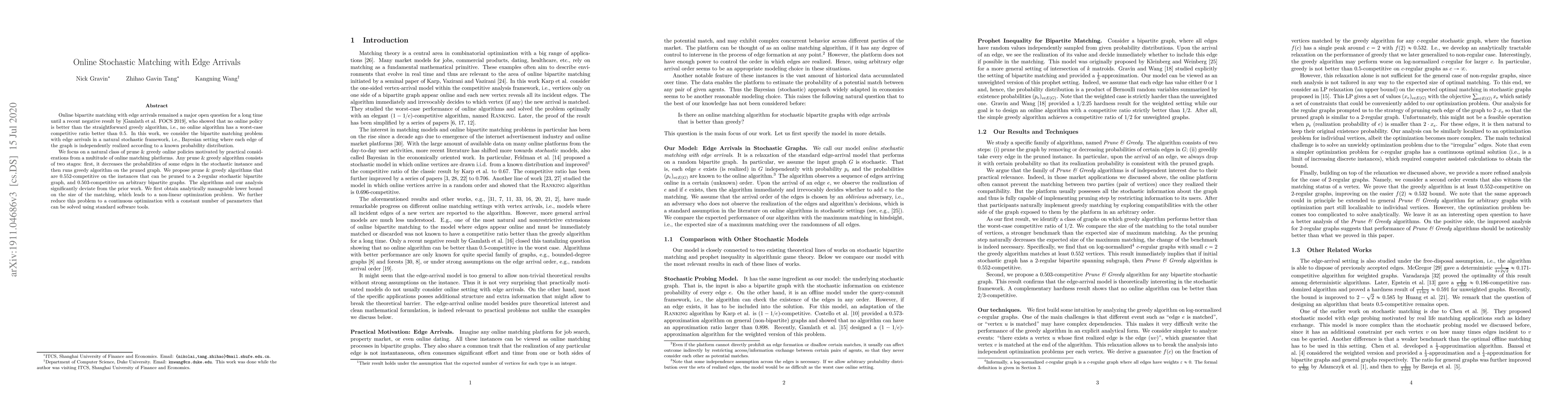 This paper addresses the online bipartite matching problem with stochastic edge arrivals, proposing prune & greedy algorithms that achieve competitive ratios of $0.552$ for $2$-regular graphs and $0.503$ for general graphs. The analysis introduces a novel lower bound on matching size, transforming the problem into a continuous optimization solvable by standard tools.