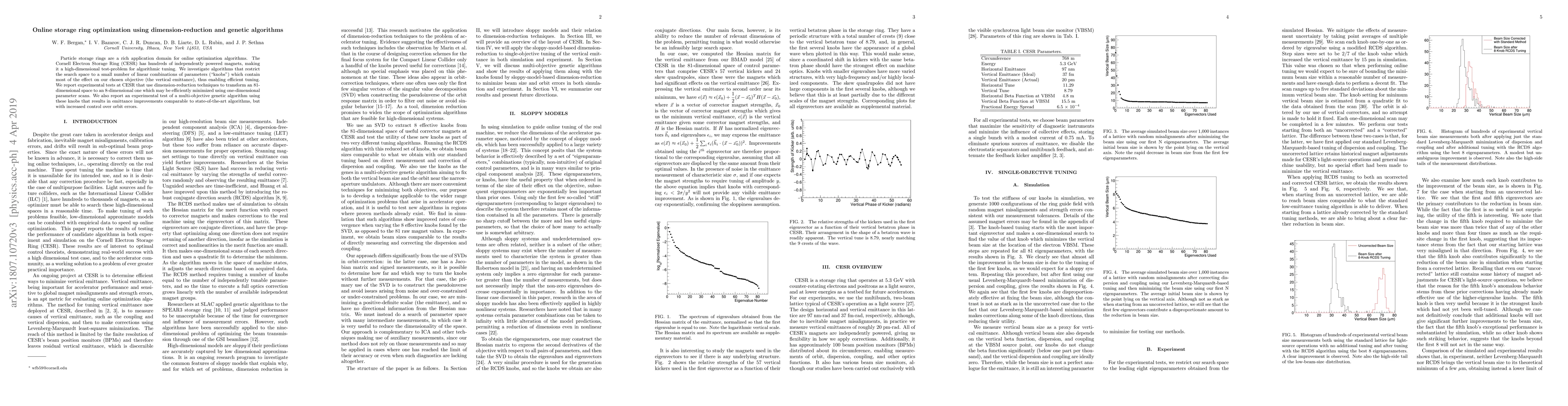 Particle storage rings are a rich application domain for online optimization algorithms. The Cornell Electron Storage Ring (CESR) has hundreds of independently powered magnets, making it a high-dimensional test-problem for algorithmic tuning. We investigate algorithms that restrict the search space to a small number of linear combinations of parameters ("knobs") which contain most of the effect on our chosen objective (the vertical emittance), thus enabling efficient tuning. We report experimental tests at CESR that use dimension-reduction techniques to transform an 81-dimensional space to an 8-dimensional one which may be efficiently minimized using one-dimensional parameter scans. We also report an experimental test of a multi-objective genetic algorithm using these knobs that results in emittance improvements comparable to state-of-the-art algorithms, but with increased control over orbit errors.