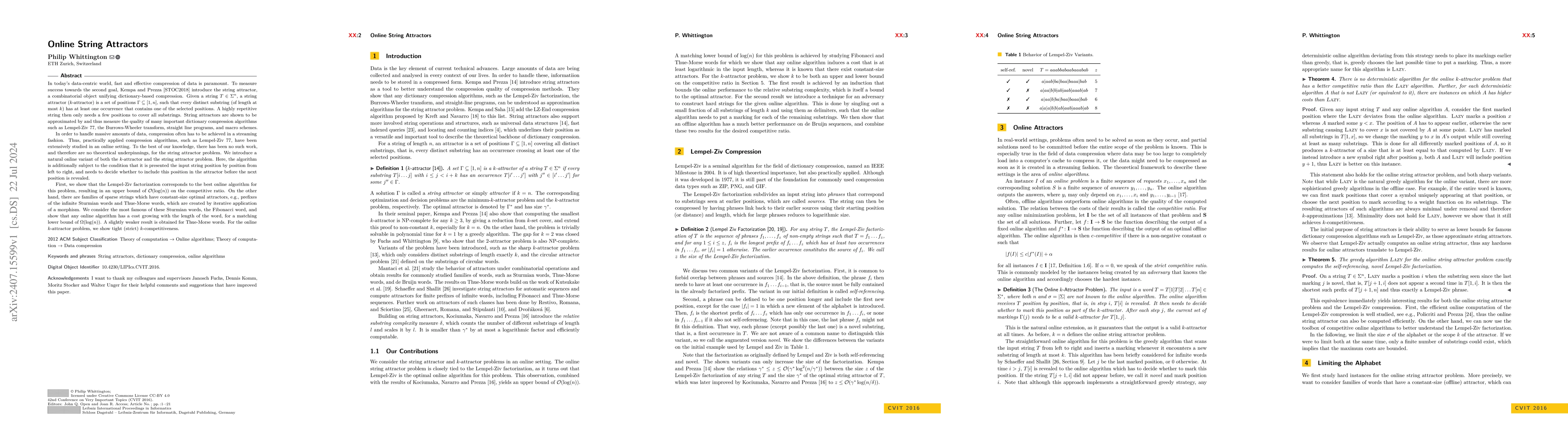 The paper introduces an online variant of the string attractor problem and analyzes it in the context of Lempel-Ziv 77 factorization, showing its competitive ratio is O(log(n)) and providing lower bounds for sparse strings like Fibonacci and Thue-Morse words.