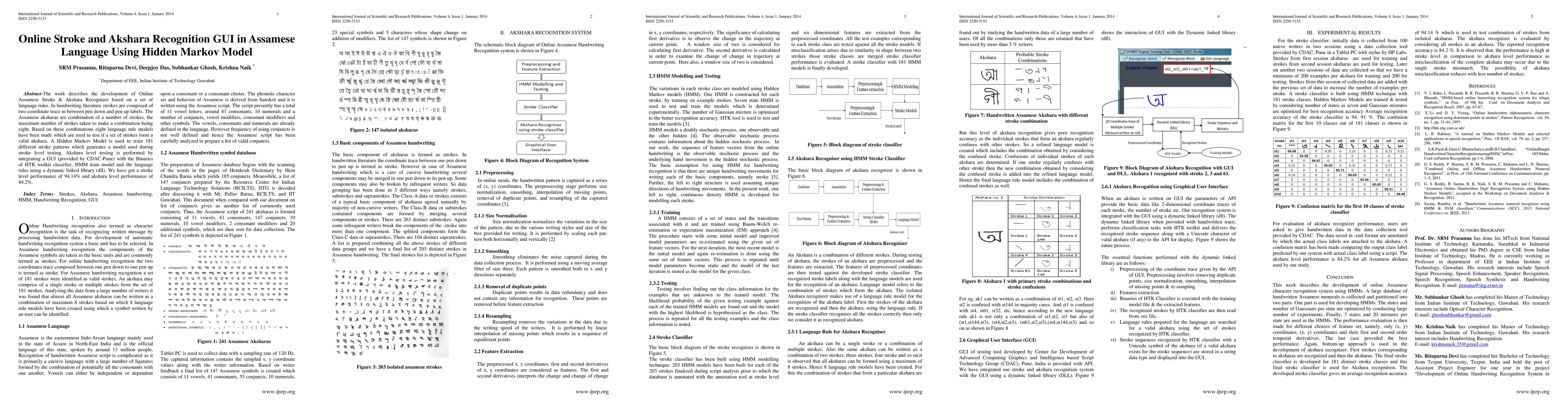 The paper details the creation of an Online Assamese Stroke & Akshara Recognizer using Hidden Markov Models. It achieved a stroke level accuracy of 94.14% and an akshara level accuracy of 84.2%, integrating a GUI with HTK toolkit classifiers and language rules.