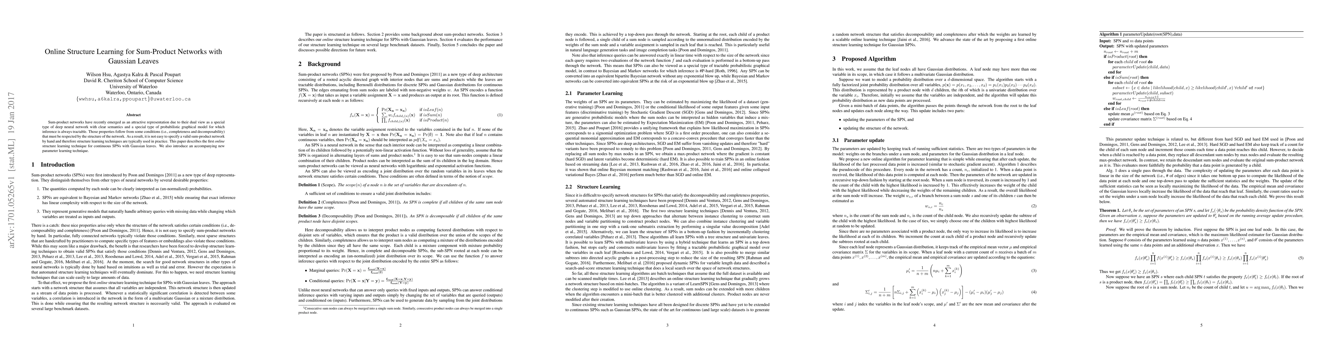 This paper presents the first online structure learning method for continuous sum-product networks (SPNs) with Gaussian leaves, alongside a new parameter learning technique, addressing the challenge of specifying valid network structures automatically.