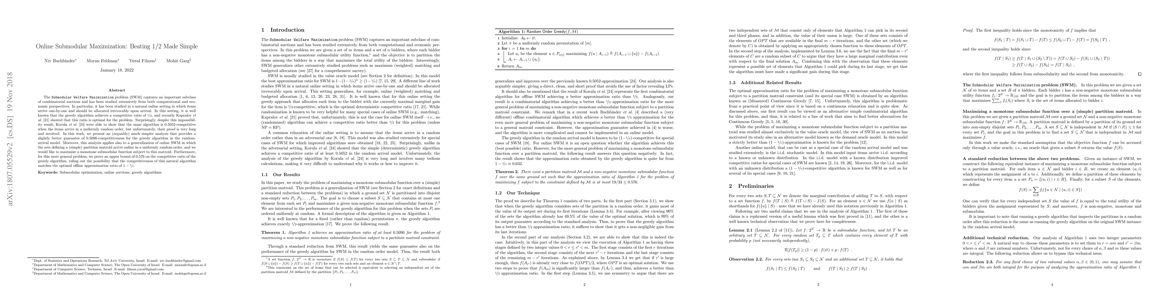 The Submodular Welfare Maximization problem (SWM) captures an important subclass of combinatorial auctions and has been studied extensively from both computational and economic perspectives. In particular, it has been studied in a natural online setting in which items arrive one-by-one and should be allocated irrevocably upon arrival. In this setting, it is well known that the greedy algorithm achieves a competitive ratio of 1/2, and recently Kapralov et al. (2013) showed that this ratio is optimal for the problem. Surprisingly, despite this impossibility result, Korula et al. (2015) were able to show that the same algorithm is 0.5052-competitive when the items arrive in a uniformly random order, but unfortunately, their proof is very long and involved. In this work, we present an (arguably) much simpler analysis that provides a slightly better guarantee of 0.5096-competitiveness for the greedy algorithm in the random-arrival model. Moreover, this analysis applies also to a generalization of online SWM in which the sets defining a (simple) partition matroid arrive online in a uniformly random order, and we would like to maximize a monotone submodular function subject to this matroid. Furthermore, for this more general problem, we prove an upper bound of 0.576 on the competitive ratio of the greedy algorithm, ruling out the possibility that the competitiveness of this natural algorithm matches the optimal offline approximation ratio of 1-1/e.