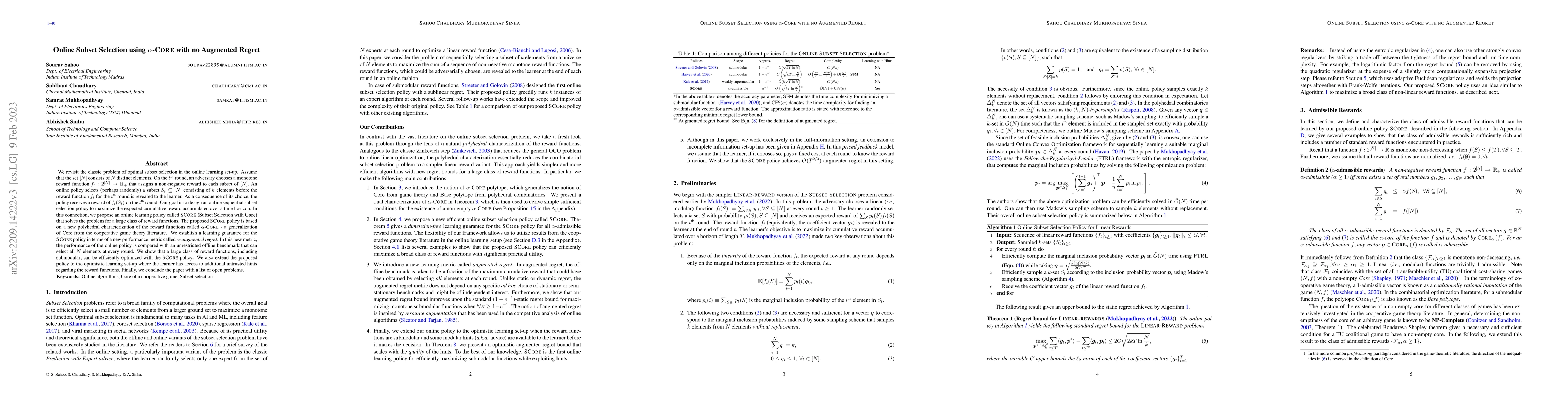 We revisit the classic problem of optimal subset selection in the online learning set-up. Assume that the set $[N]$ consists of $N$ distinct elements. On the $t$th round, an adversary chooses a monotone reward function $f_t: 2^{[N]} \to \mathbb{R}_+$ that assigns a non-negative reward to each subset of $[N].$ An online policy selects (perhaps randomly) a subset $S_t \subseteq [N]$ consisting of $k$ elements before the reward function $f_t$ for the $t$th round is revealed to the learner. As a consequence of its choice, the policy receives a reward of $f_t(S_t)$ on the $t$th round. Our goal is to design an online sequential subset selection policy to maximize the expected cumulative reward accumulated over a time horizon. In this connection, we propose an online learning policy called SCore (Subset Selection with Core) that solves the problem for a large class of reward functions. The proposed SCore policy is based on a new polyhedral characterization of the reward functions called $\alpha$-Core - a generalization of Core from the cooperative game theory literature. We establish a learning guarantee for the SCore policy in terms of a new performance metric called $\alpha$-augmented regret. In this new metric, the performance of the online policy is compared with an unrestricted offline benchmark that can select all $N$ elements at every round. We show that a large class of reward functions, including submodular, can be efficiently optimized with the SCore policy. We also extend the proposed policy to the optimistic learning set-up where the learner has access to additional untrusted hints regarding the reward functions. Finally, we conclude the paper with a list of open problems.