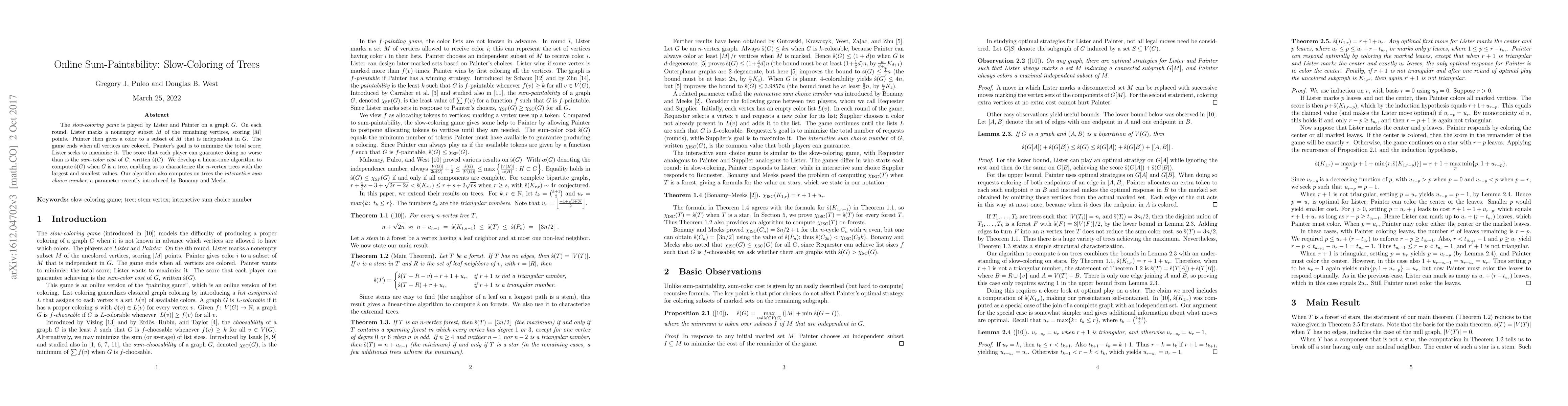This paper presents a linear-time algorithm for computing the sum-color cost of trees in the slow-coloring game, where Lister and Painter compete to score on vertex subsets. The study characterizes trees with the largest and smallest sum-color costs and introduces an algorithm to compute the interactive sum choice number for trees.